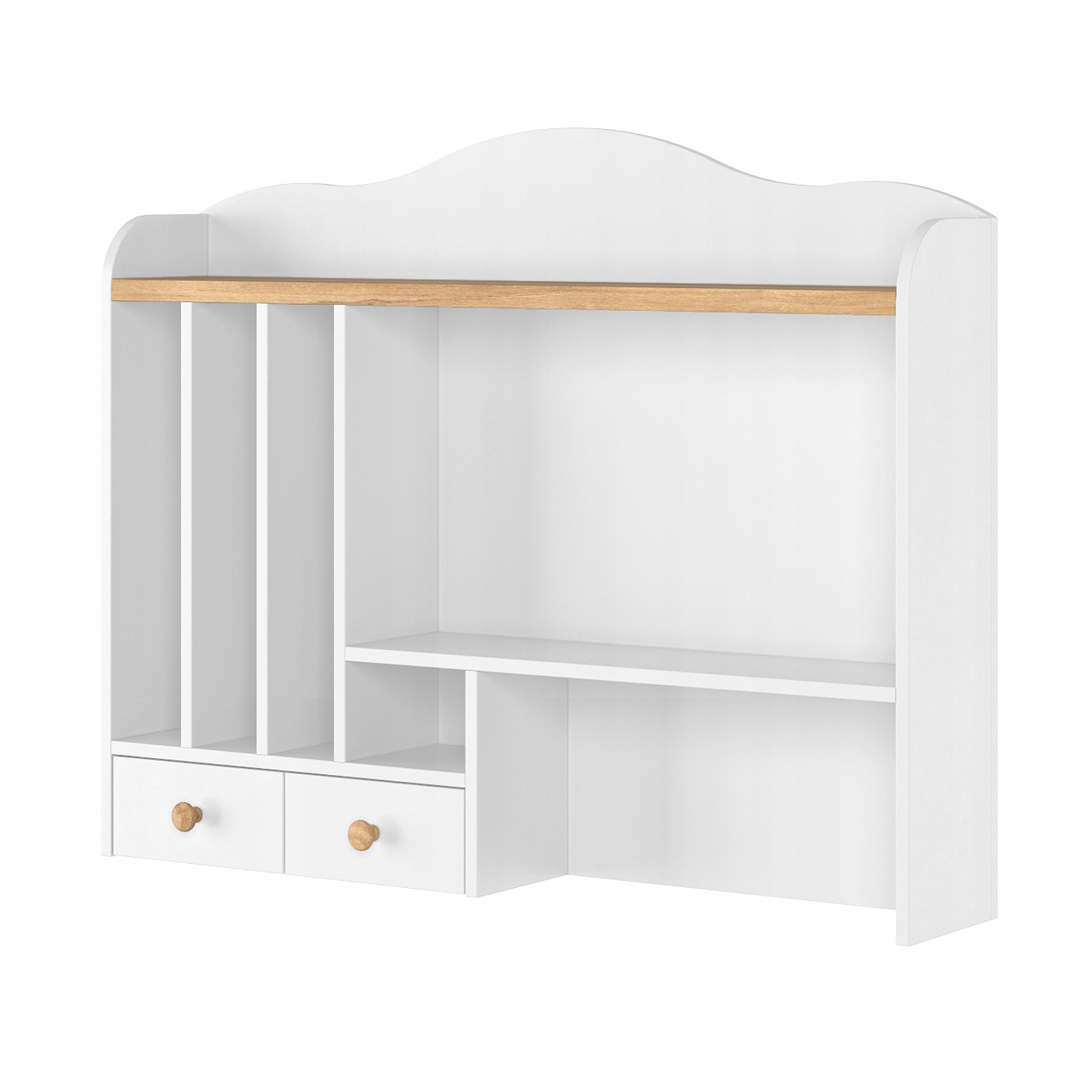 Блок розширення над столом із функціональні полиці та ящики. Це просто та естетично організує простір навколо столу. Меблі виготовлені з міцної ламінованої плити з міцною кромкою ABS. Ручки з пластику.