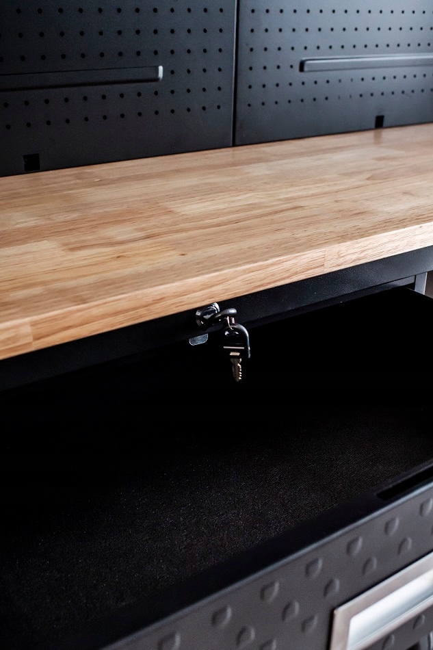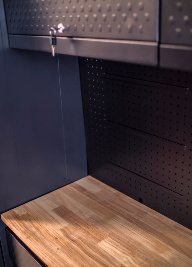 - Повне рішення : набір включає шафи та робочу таблицю, створюючи всебічне робоче місце. Потреби потребить матеріали, що надає тривалий час, потребує міцності. Семінарні шафи : Для додаткової безпеки гардеробу у них є замки, які захищають цінні інструменти. поверхні.