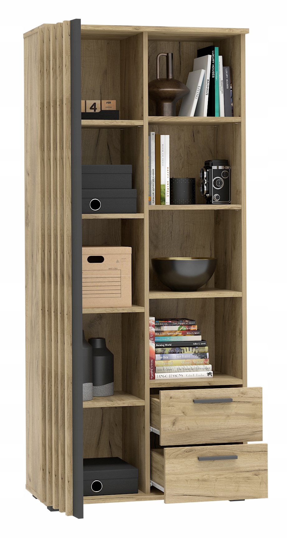 - Відкриті полиці для книг, коробки, прикрас