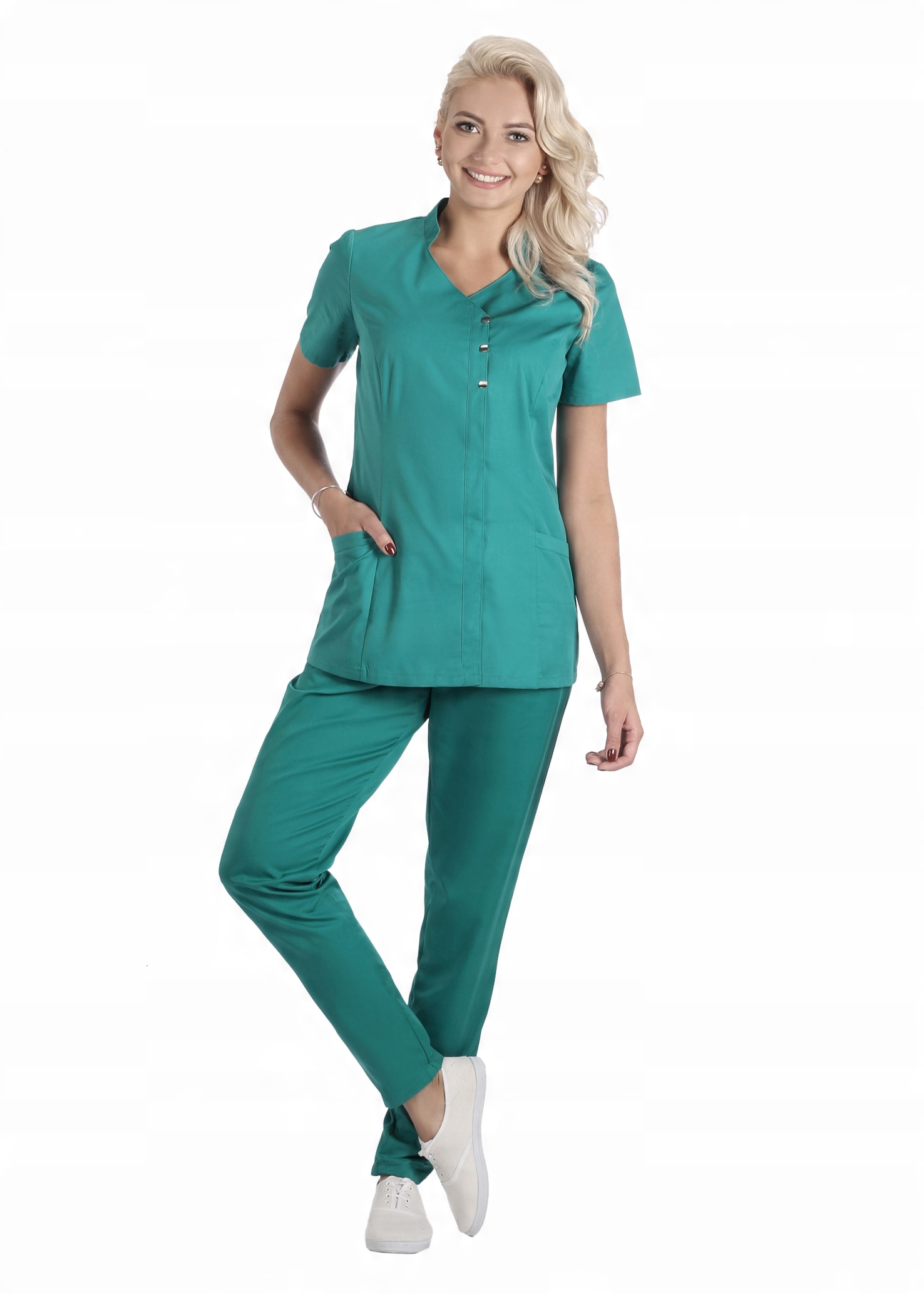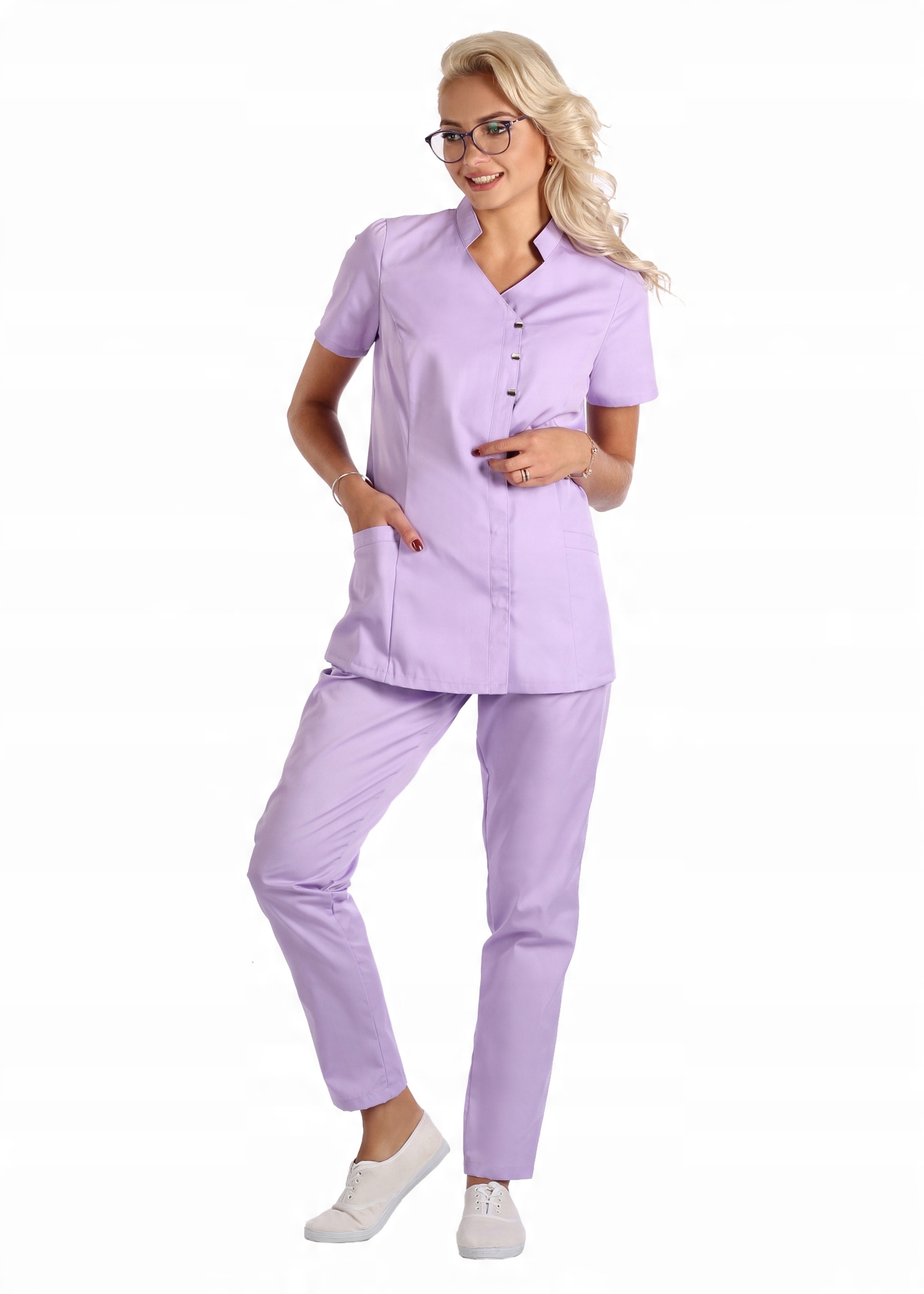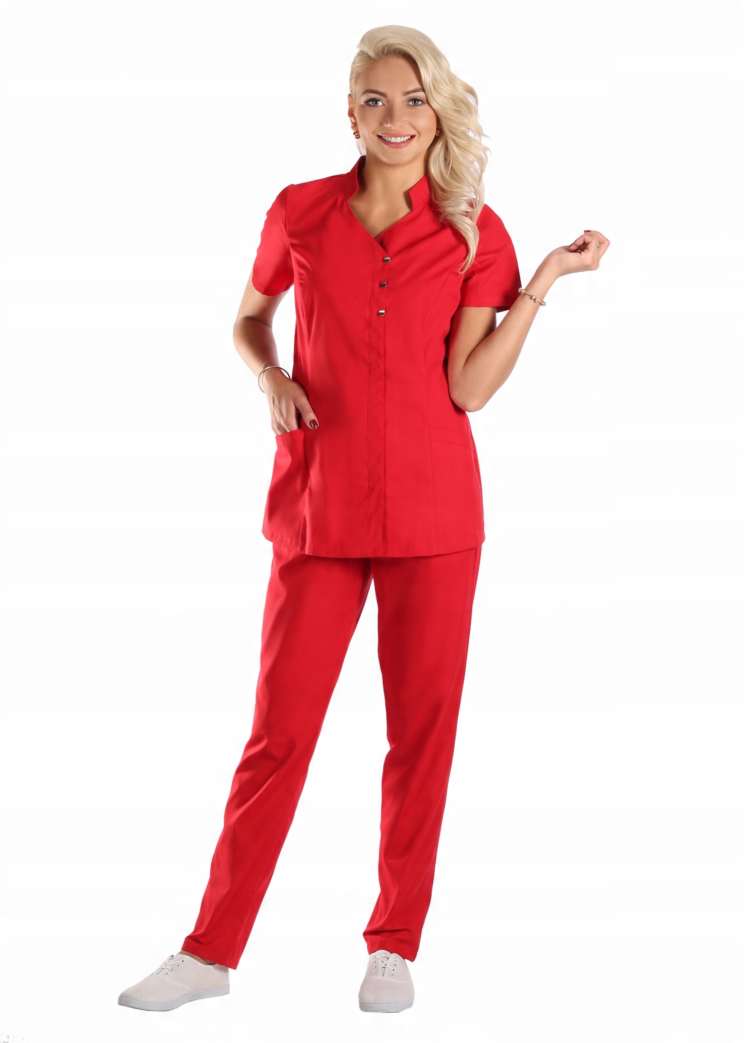 Куфта медична або косметичка найкраще поєднується з вузькими брюками. Декоративних застібок 3, решта приховані під вертикальною смужкою для схуднення. Французькі розрізи спереду формують жіночий силует. Дві кишені (тут рекомендуємо розмістити логотип компанії або зображення флока.