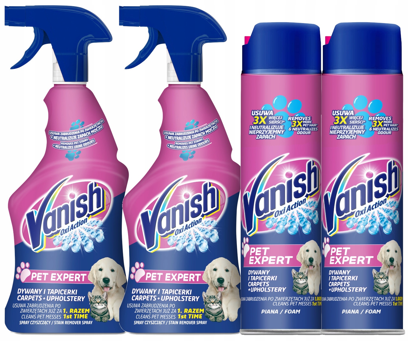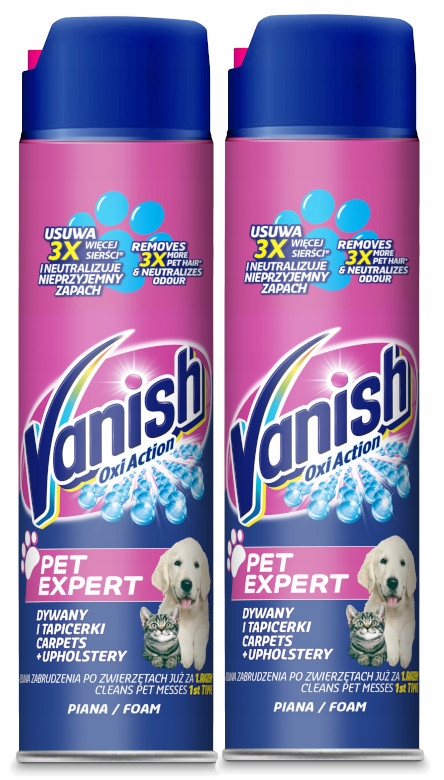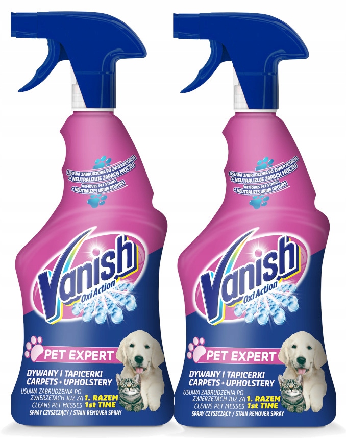 Миючий спрей Vanish Pet Expert видаляє плями від домашніх тварин з килимів і оббивки з першого разу. Він усуває в 3 рази більше волосся, бруду та бруду та ефективно нейтралізує неприємні запахи. Простий у використанні спрей наноситься безпосередньо на брудний килим або оббивку дивана чи дивана. Спеціальна формула Vanish дозволяє точно видалити забруднення за 30 секунд. Після використання спрей Vanish Pet Expert залишає приємний лимонний аромат і додатково пом'якшує очищену поверхню. Це запобігає поверненню тварин у місця фізіологічного зараження.