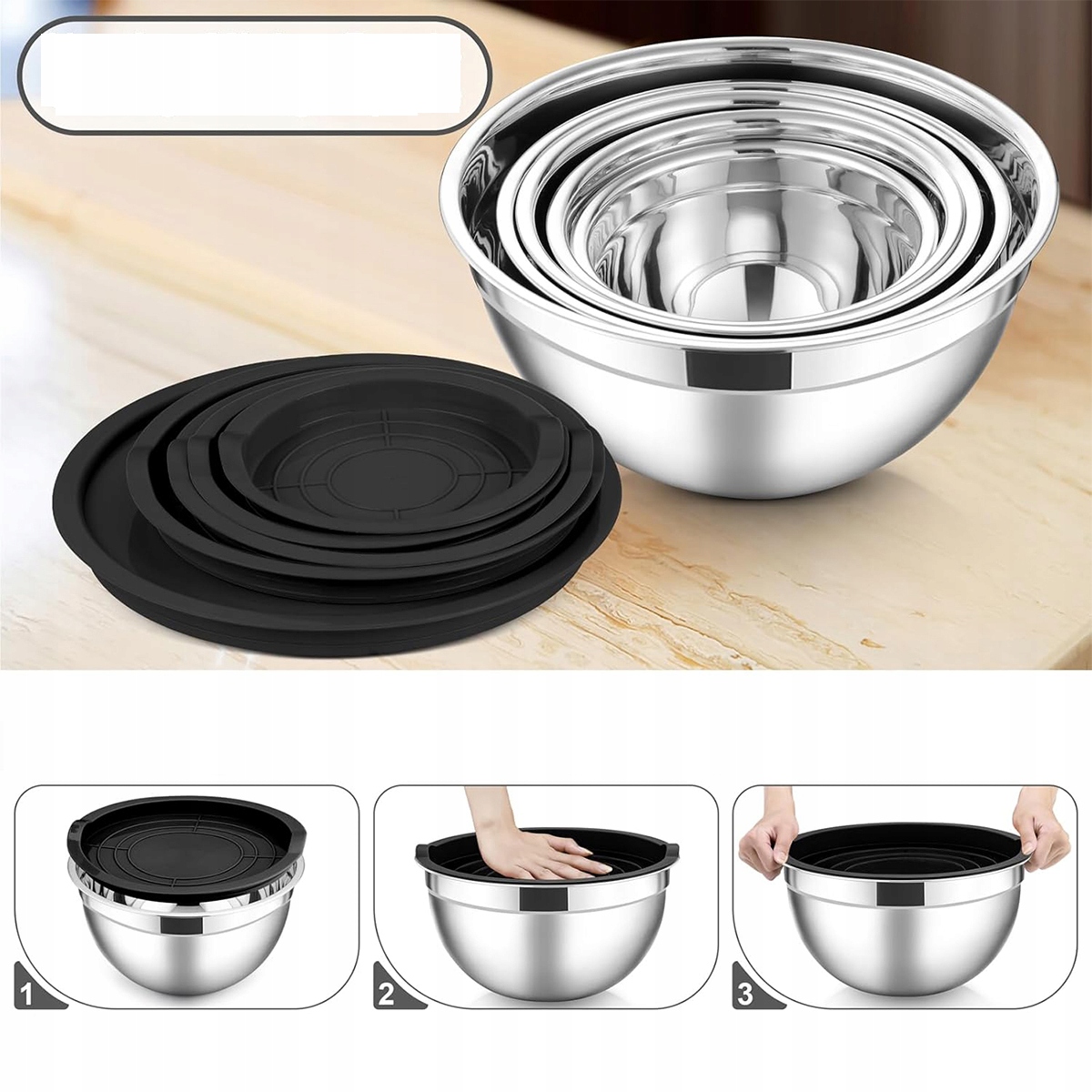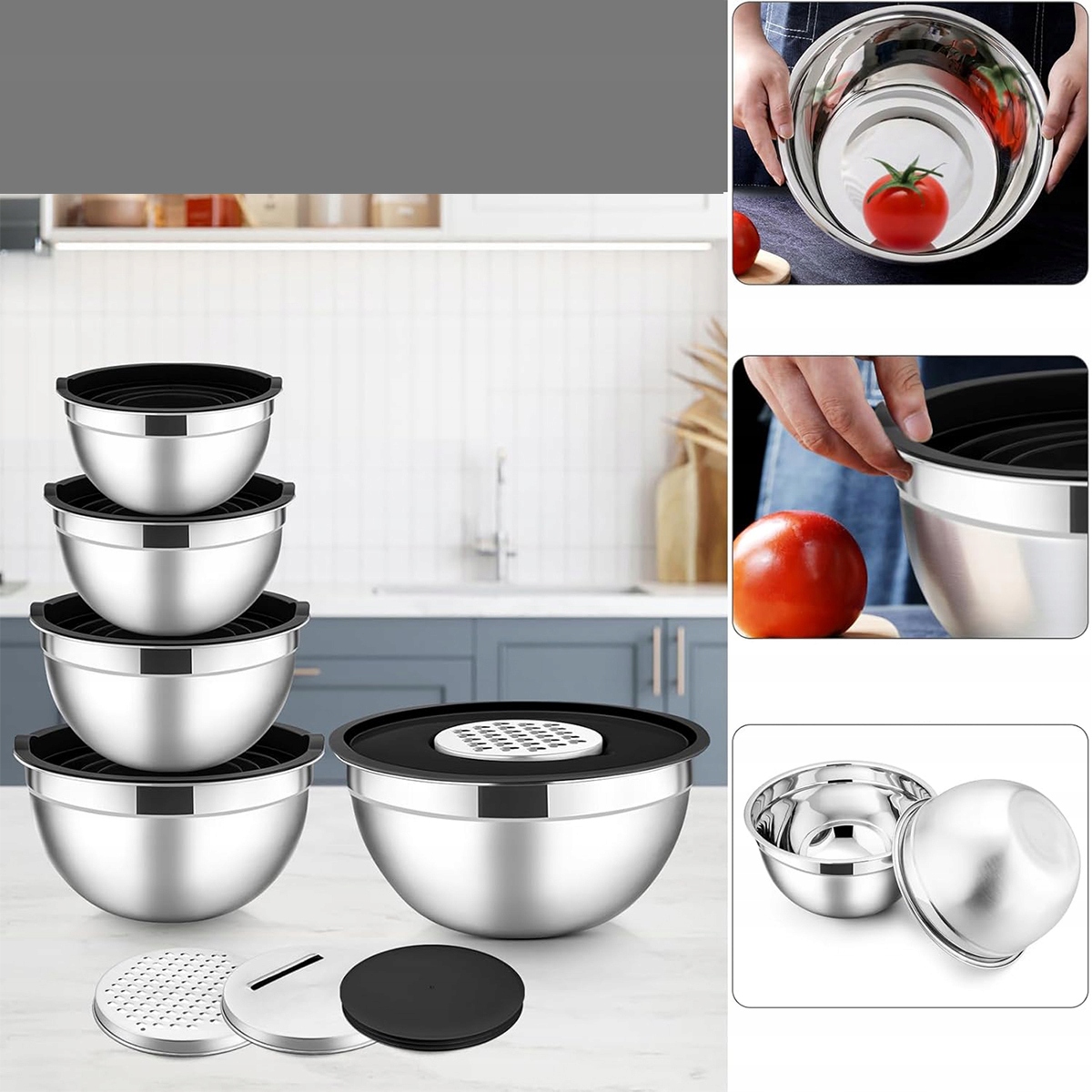 Набір із 5 салатниць, миска з нержавіючої сталі з герметичною кришкою, розміри 4,5 л, 2,7 л, 1,6 л, 1,1 л, 0,7 л, набір мисок для змішування для кухні, протиковзка та складна (срібло)