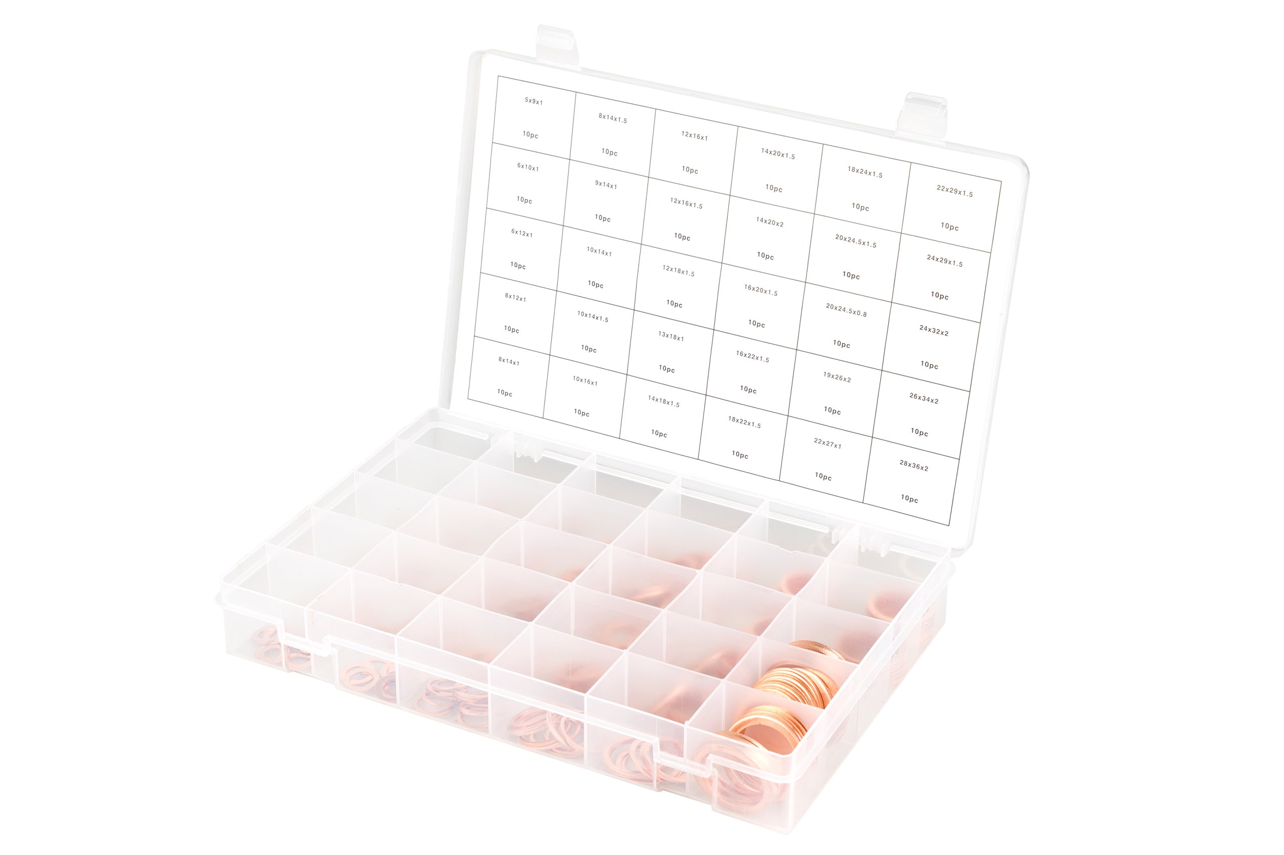 Набір якісних мідних шайб. Набір складається з найпопулярніших розмірів шайб. Шайби мають різний зовнішній і внутрішній діаметр і товщину.