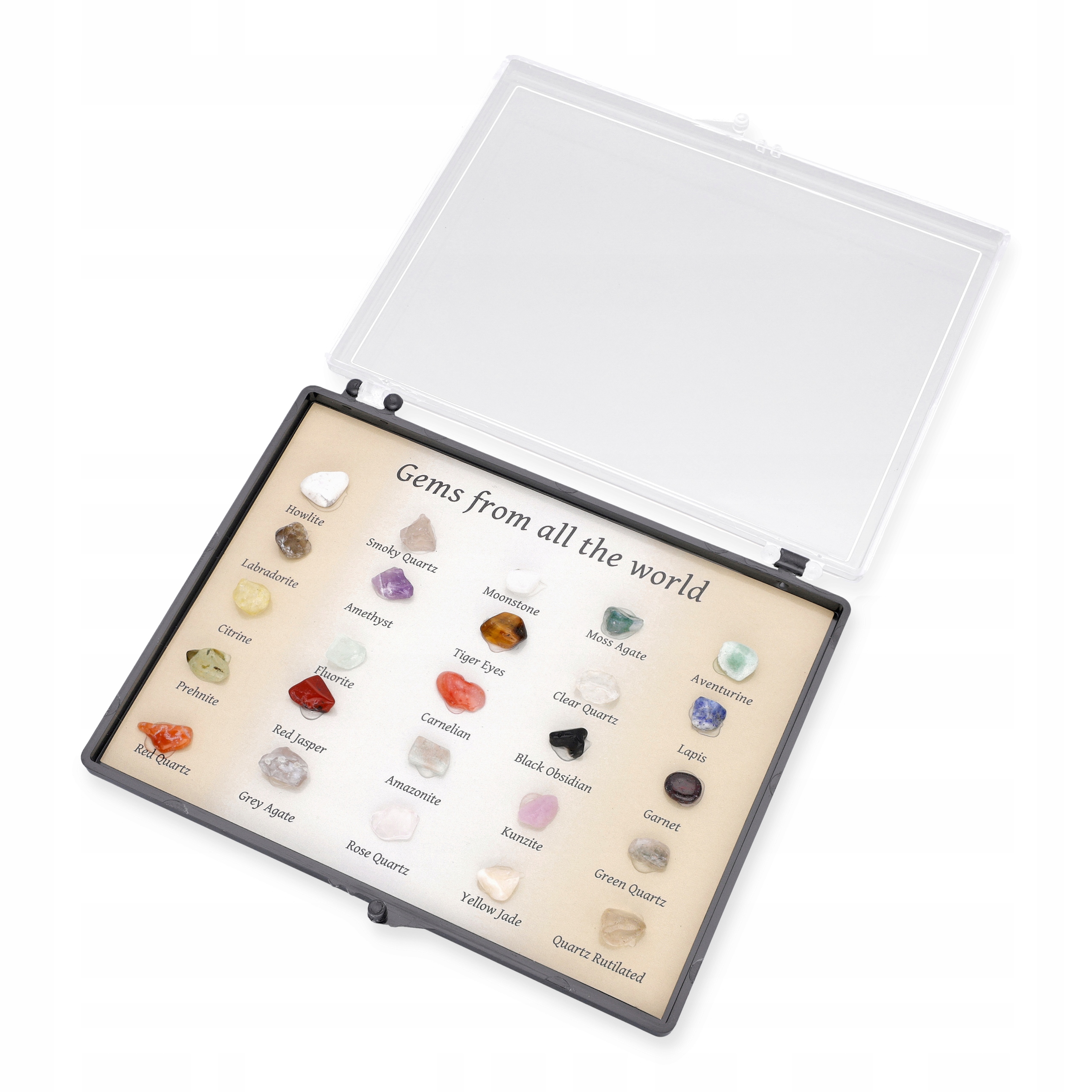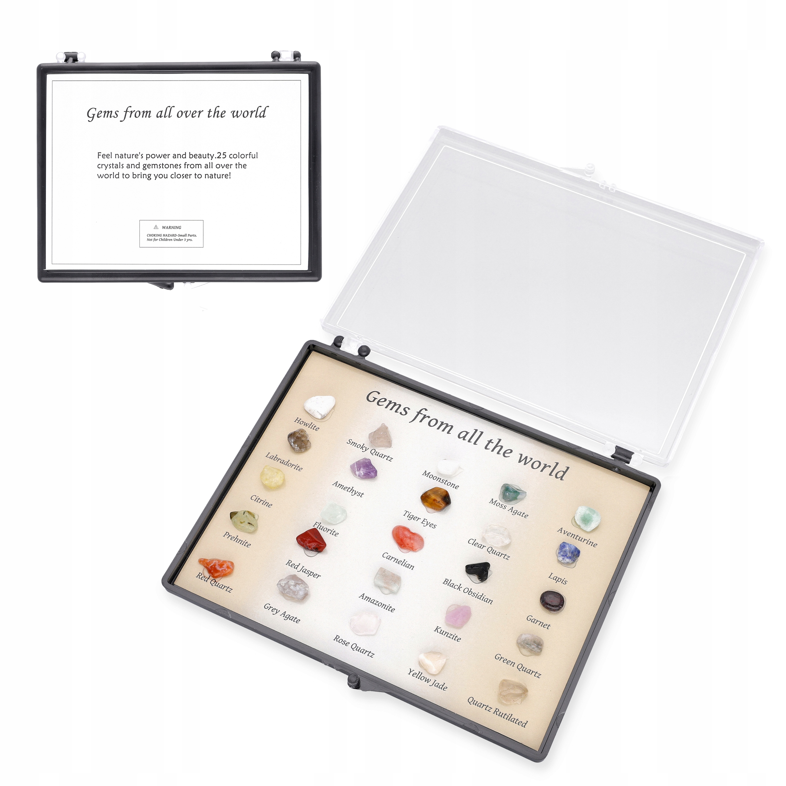 - У наборі ви знайдете аж 25 маленьких мінералів з усього світу: howll, кварца, місячний камінь, масовий агат, авентурін, лабрадорит, аметист, тигровий око, гірський тигр, лайл, флуорит, carneol, наводин Amazonit, Kunzyite, зелений кварц, червоний кварц, рожевий кварц, жовтий нефрит, звичайний кварц. Може містити включення або недосконалості.