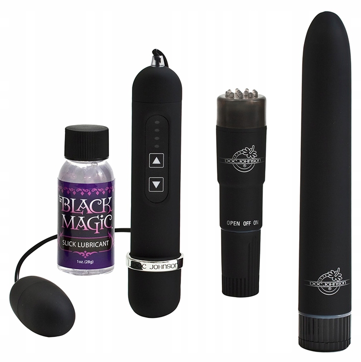 Док Джонсон представляє Black Magic Pleasure Set, вражаючу колекцію шовковисто-гладких, яскравих чорних розважальних предметів, які хвилюють і захоплюють. Почніть із відкриття чудової мастила та активуйте Pocket Rocket для задоволення клітора. Ребристий ковпачок покращує досвід заклепування. Відкрийте для себе величезні можливості з дивовижним вібратором куля/яйце. Класичний і елегантний, 7-дюймовий вібратор - це дорогоцінний камінь. Проведіть до кінця повороту, щоб досягти вибраної швидкості. Три тихі вібрації перевершать ваші очікування. Усі три вібратори водонепроникні та не містять фталатів. З великою кількістю хитрощів, якими можна поділитися, Black Magic змусить вас просити на біс!