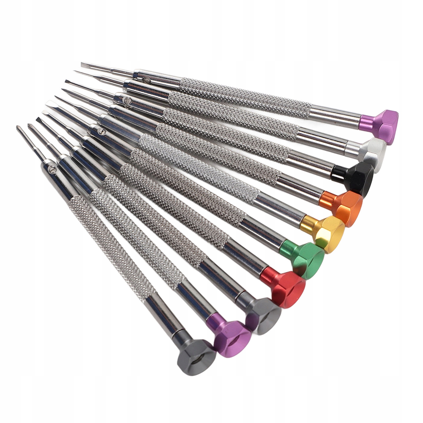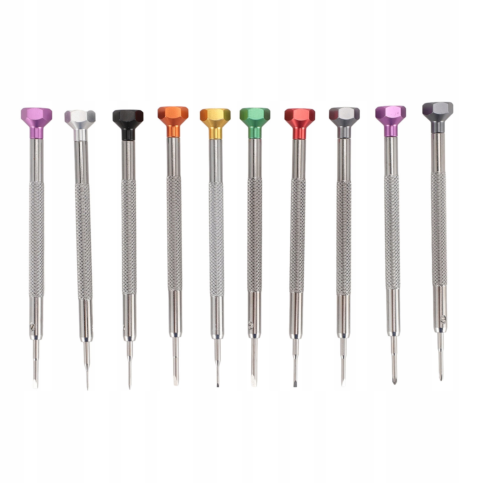 1. Набір прецизійних викруток: Набір викруток для годинника включає 8 стрічкових викруток і 2 хрестоподібні викрутки. Розміри: 0,6 мм, 0,8 мм, 1,0 мм, 1,2 мм, 1,4 мм, 1,6 мм, 1,8 мм, 2,0 мм для ремінця та 1,4 мм, 1,6 мм для поперечної планки.