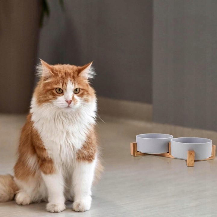 НАБІР МИСКІВ ДВОЙ КЕРАМІЧНИЙ ДЛЯ СОБАКИ І КІШКИ НА ПІДСТАВЦІ, СІРИЙ 2х400 мл