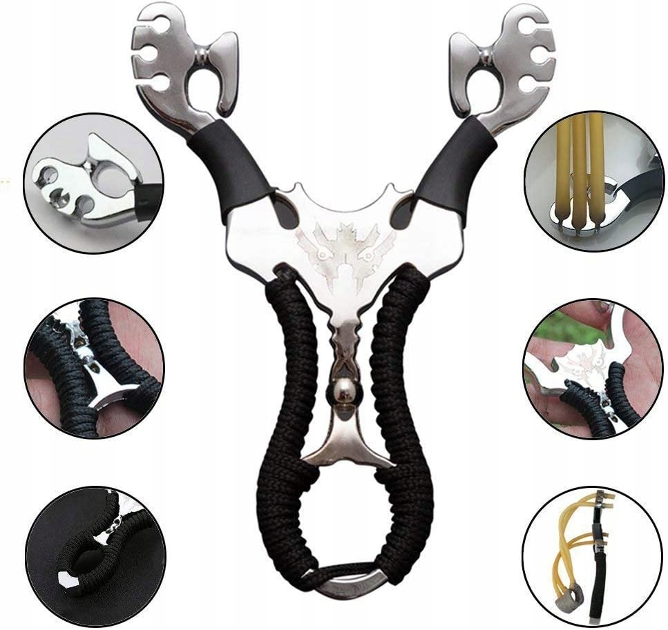 Ця катапультна рогатка виготовлена з 3 гумових стрічок, сила сильніша, відстань пострілу більш точна та швидша, найкраща рогатка для полювання. Ідеально підходить для тренування очей і уваги, розваг, змагань і полювання.