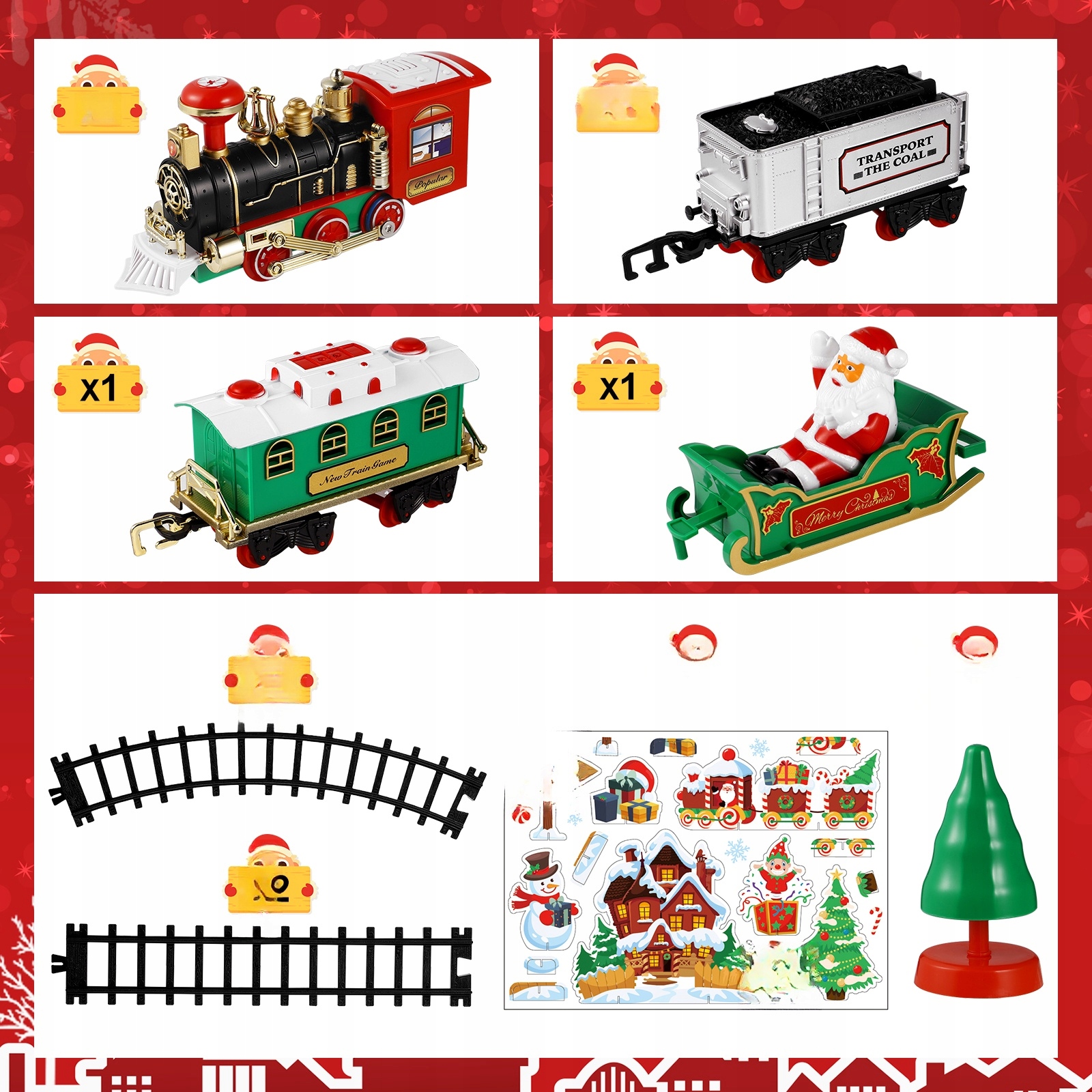 ✅Локомотив x 1 вагон x 1 вагон для вугілля x 1 пряма колія x 2 поворотні колії x 8 Санта Клаус x 1 ялинка x 1 декоративна наклейка x 1