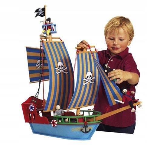 - Дерев'яний корабель із справжніми тканинними вітрилами та мотузяною драбиною. У набір входять рухомі елементи та аксесуари, завдяки яким дитина дасть волю своїй уяві та розважиться! Тільки тепер він може переплисти сім морів, кинути якір біля узбережжя, доплисти на невеликому човні до пляжу і закопати там скарби.