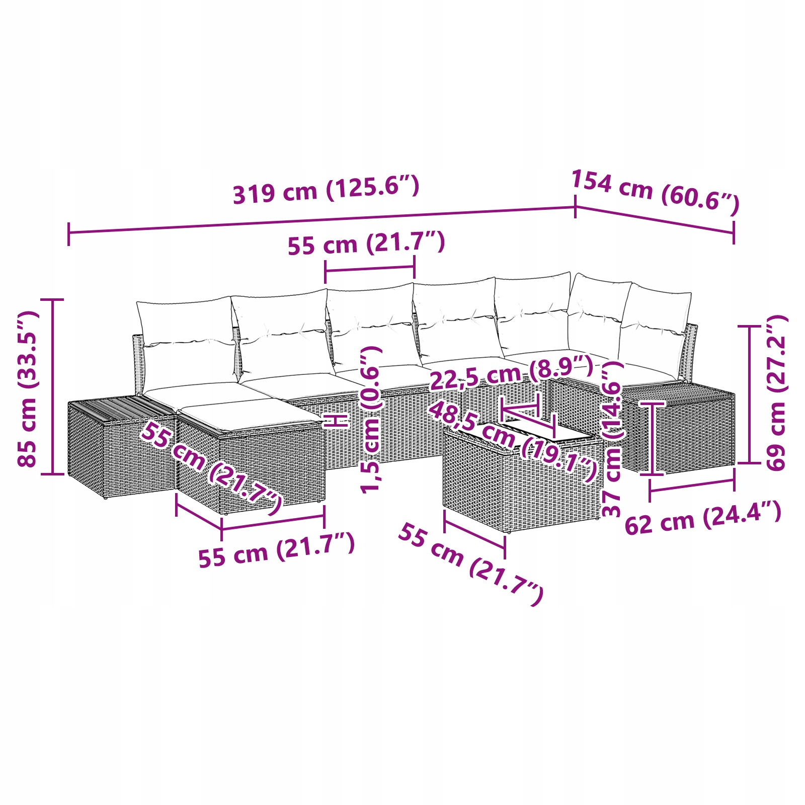 - Модульна конструкція: Набір дозволяє проводити гнучкі розташування, завдяки яким він ідеально вписується як у невеликі, так і на більші зовнішні простори. Подушки, виготовлені з поліестеру, легко приймати та чистити, що полегшує їх чистими та свіжими. Це додає елегантності будь -якому космосу.