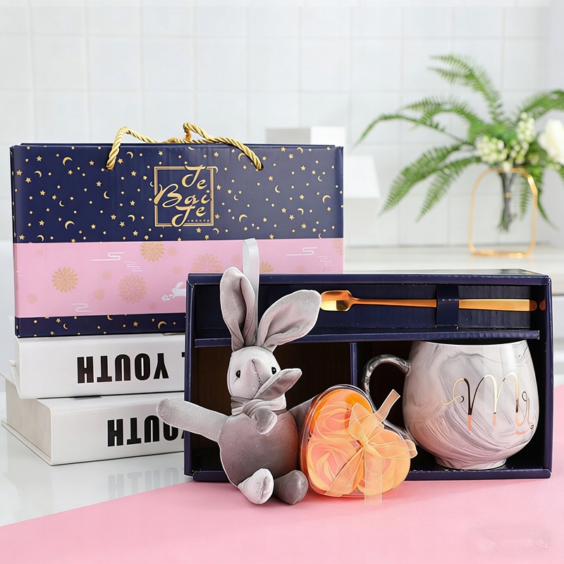 4.Подарунок коробка, кухоль, ложка, побажання кролика, трояндове мило (сіре)