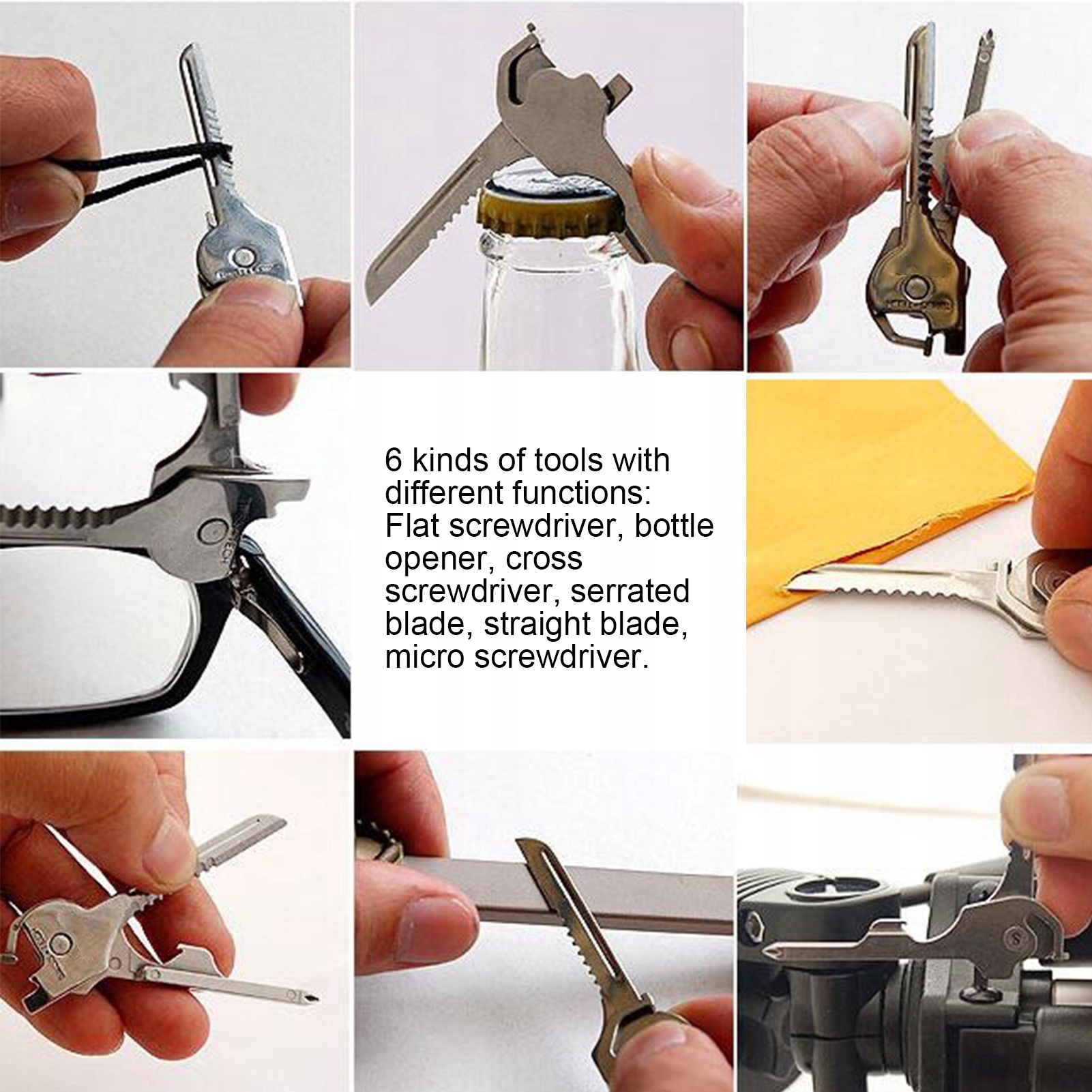 1. 6 інструментів із різними функціями: плоска викрутка, відкривачка для пляшок, хрестова викрутка, зубчасте лезо, пряме лезо та мікровикрутка. 2. Завдяки компактному дизайну він має такий самий розмір, як звичайний ключ для дому, і не займає місце в кишені. 3、Його можна прикріпити до будь-якого брелока, дуже зручно носити з собою і не легко втратити. 4. Цей інструмент легкий, ефективний, універсальний і зручний, підходить для внутрішнього та зовнішнього використання. 5. Виготовлена з нержавіючої сталі, яка не піддається іржавінню, міцна у використанні та має тривалий термін служби.