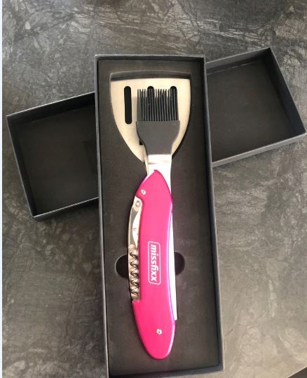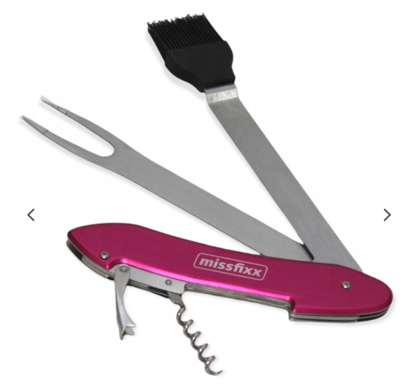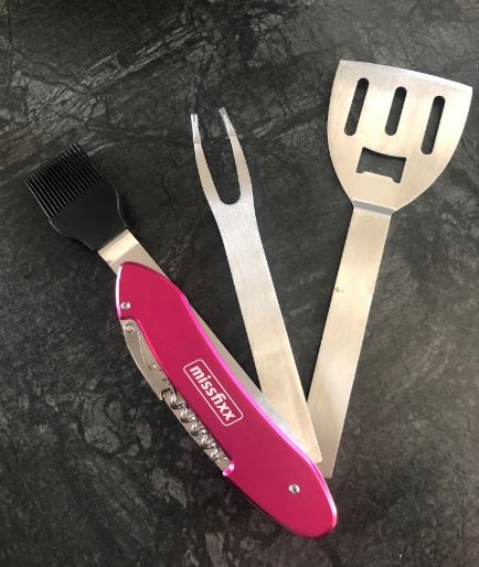 Інструмент складається з вилки для яловичини, лопатки, пензлика для маринування, відкривачки для пляшок, штопора та всього в нашому улюбленому рожевому кольорі.
