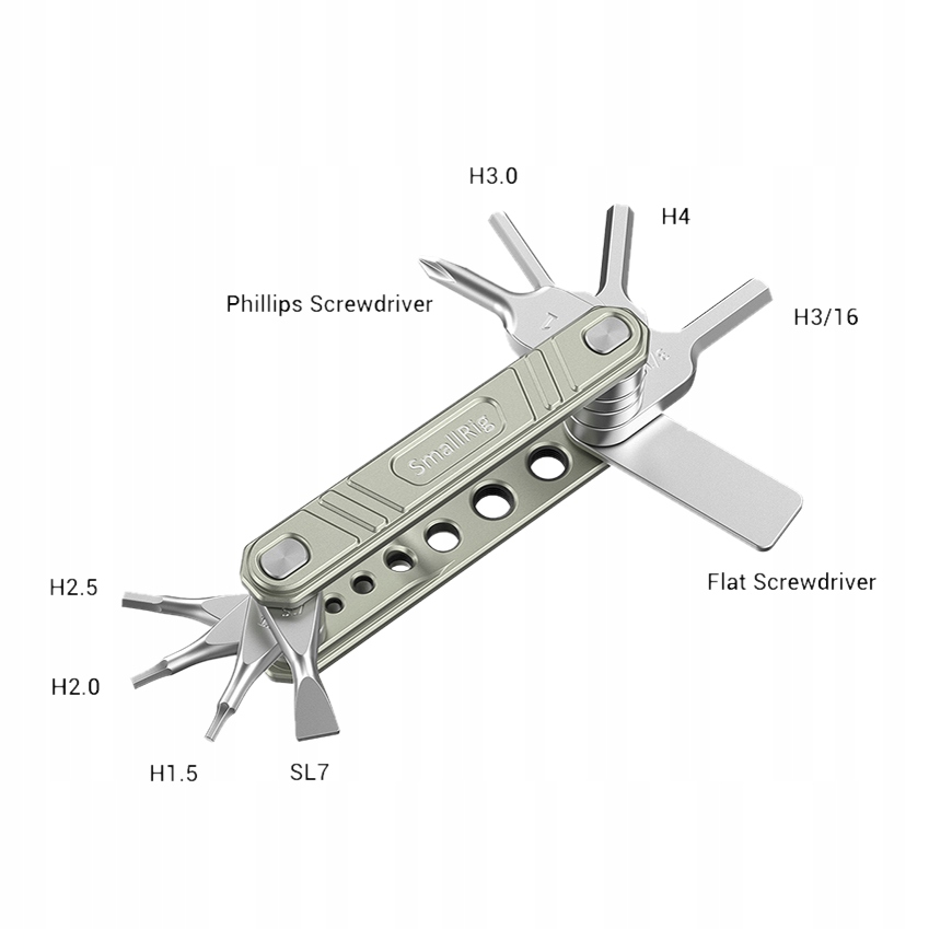 SmallRig — універсальний складаний багатофункціональний інструмент для відеокамер, який поєднує в собі 9 інструментів, корисних для роботи з відеокамерами, оснащеними різьбовими отворами. Виготовлений з нержавіючої сталі та алюмінію. Різьбові отвори з одного боку забезпечують місце для зберігання гвинтів M2,5, M3, M4, M5 і 1/4"-20