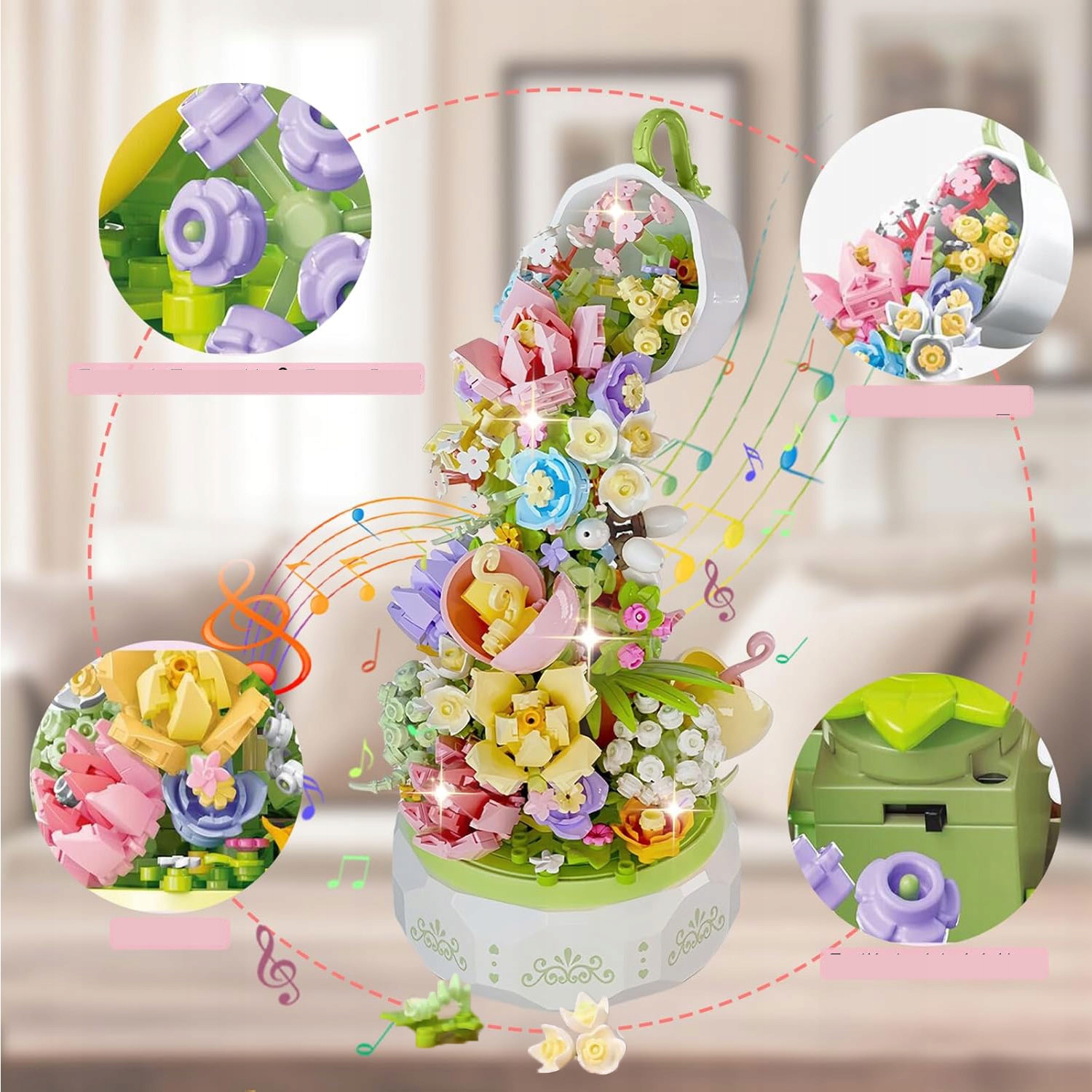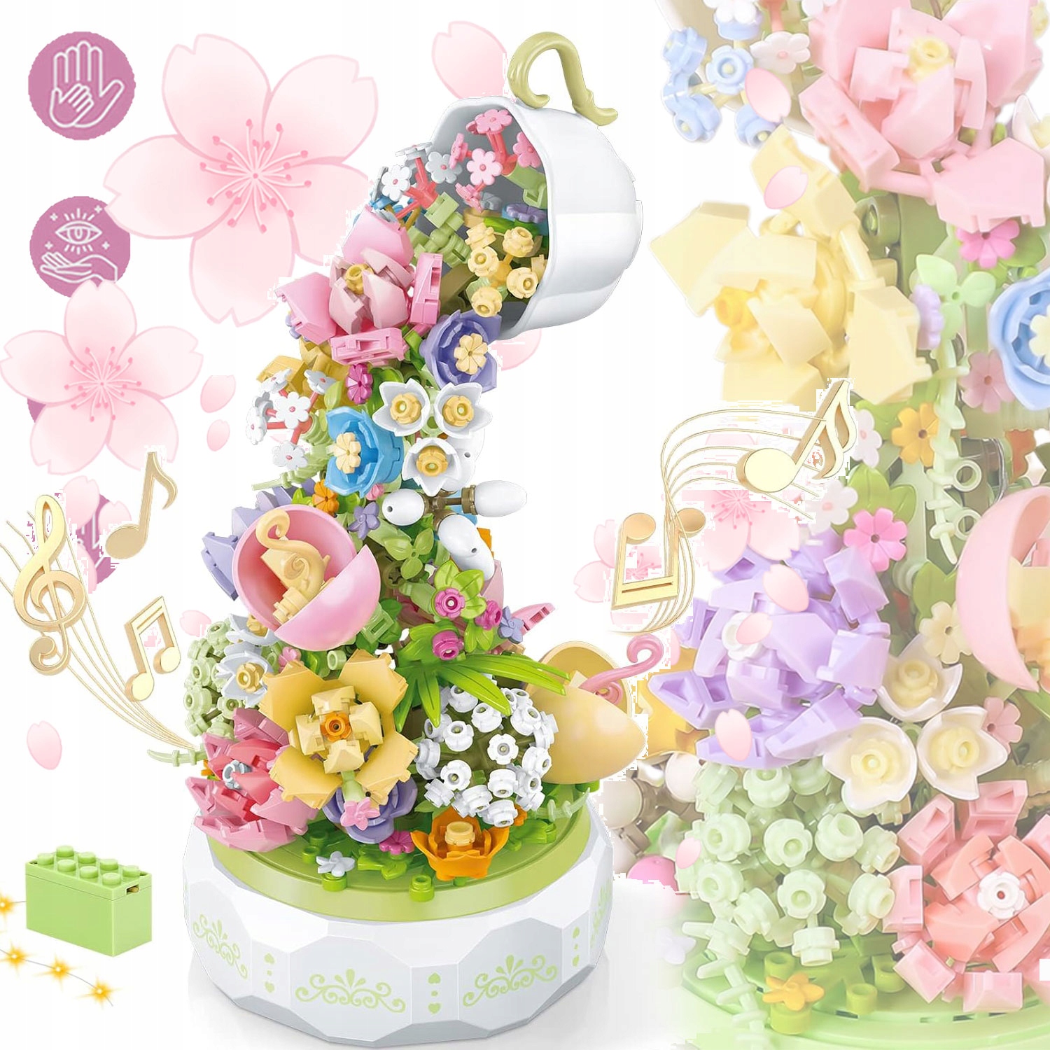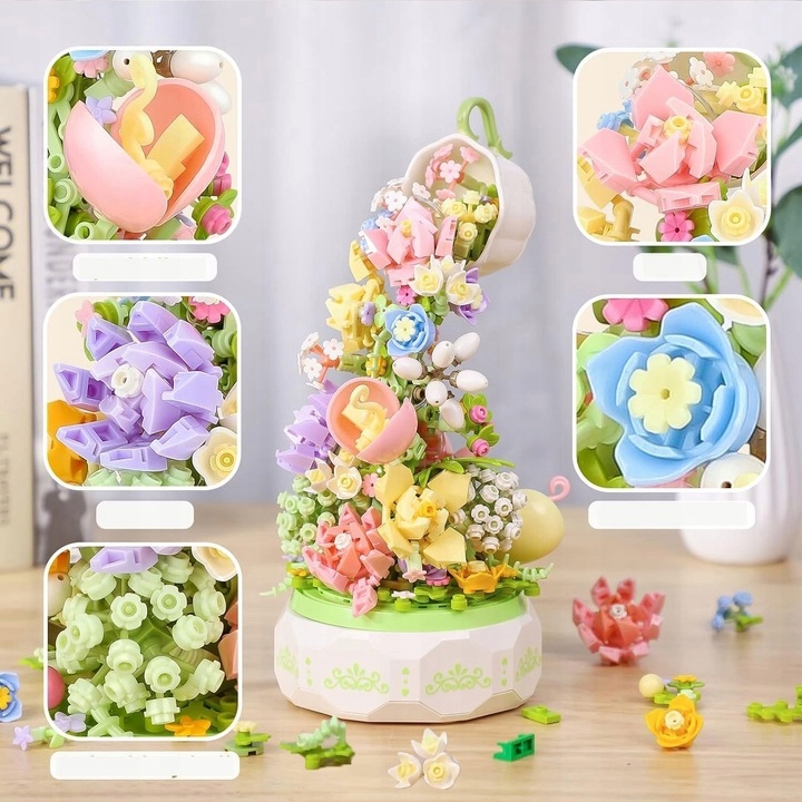 🎵 Розслаблююча мелодія - коли блоки вдаряються об музичну скриньку, квіти обертатися, блокова музична скринька змушує блоки рухатися разом з музикою. Чашка і квітка грають ніжну мелодію. Дітям сподобається ця весела механічна музична скринька, що обертається.