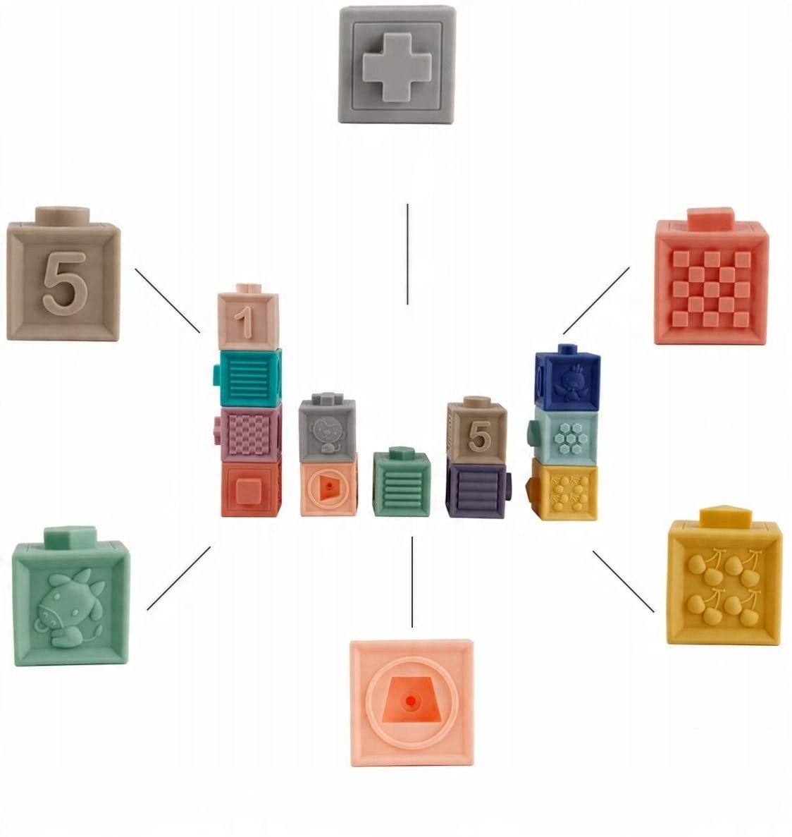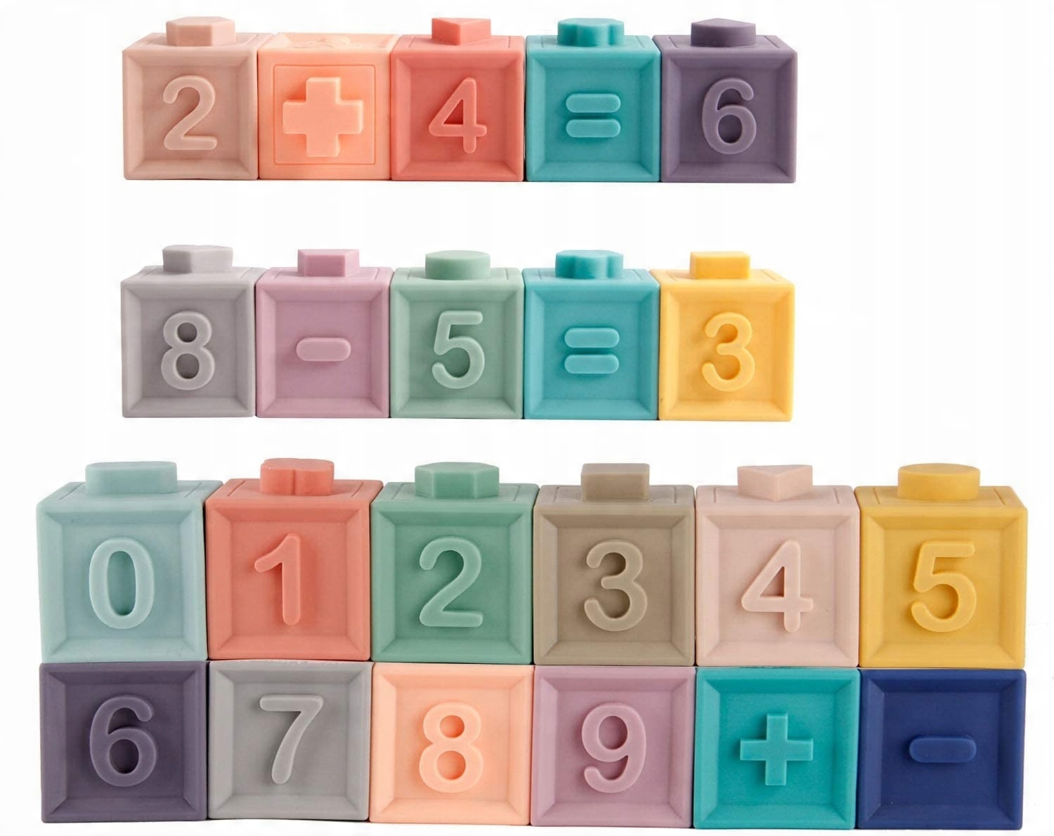 На кожному з блоків є опуклі цифри, геометричні фігури, фігури, математичні знаки, тварини, фрукти та картинки. Це впливає на розвиток чуття та дотику. Ми можемо з'єднати блоки разом. Завдяки своїй структурі вони ідеально підходять як прорізувачі для немовлят. При натисканні - скриплять. З ними можна грати у воді. Вони розвивають зорову та слухову координацію та моторику дитини.