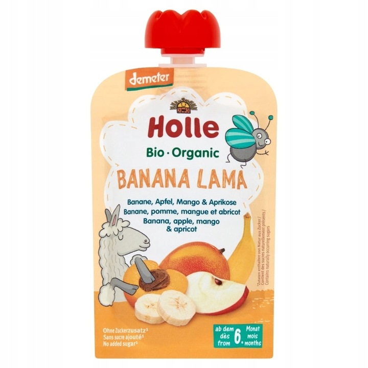 Приготований на основі бананів, яблук, манго та абрикосів, укладений у практичний пакетик, що закривається. Манго є багатим джерелом калію, вітаміну С і вітамінів групи В, які зміцнюють нервову та імунну систему нашої дитини. Однак яблука, які є не тільки цінним джерелом вітаміну С, завдяки клітковині регулюють роботу кишечника і захищають від запорів. Абрикоси багаті не тільки бета-каротином, але також, завдяки великій кількості калію, вони регулюють артеріальний тиск і роботу нирок. Вони містять багато заліза, кальцію, фосфору, вітамінів групи В, С, РР і клітковини. Вони покращують травлення і запобігають анемії. Корм із маркою Demeter вирощується відповідно до суворих стандартів біодинамічного землеробства в гармонії з природою.
