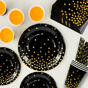 - Набір святкового посуду Black Gold: чорно-золотий посуд із крапками включає 24 золоті та чорні паперові тарілки діаметром 18 см, 24 чорно-золоті тарілки золота та чорного кольору діаметром 23 см, 24 чорні чашки, 24 серветки з чорними та золотими крапками, 1 скатертину з чорними та золотими крапками тощо – усі аксесуари для вечірки чорного кольору.