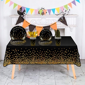 Чорно-золотистий посуд у горошок характеризується шикарним дизайном, який поєднує таємницю чорного з красою золота та забезпечує унікальний кулінарний досвід для дітей, які відвідують чорно-золотий день народження.