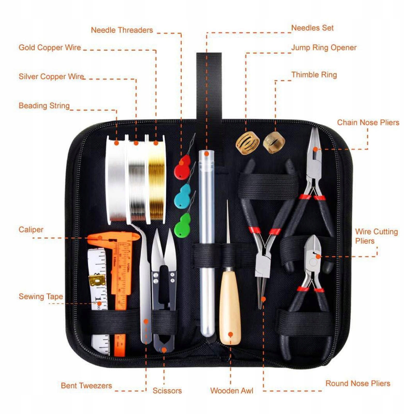 вміст упаковки - комплект ювелірних виробів містить 3 ювелірні плоскогубці, 2 мідні дротяні валики, 1 прозора струна для різьблення (6), 1 пінцетів, 1 сидр, 1 культація, 1 szydło , 1 відкривачка для намистин, 1 пухирі, 1 ножиці, заходи, 3 нитки, 1 та коробка з 13 різних типів елементів Ювелірні вироби