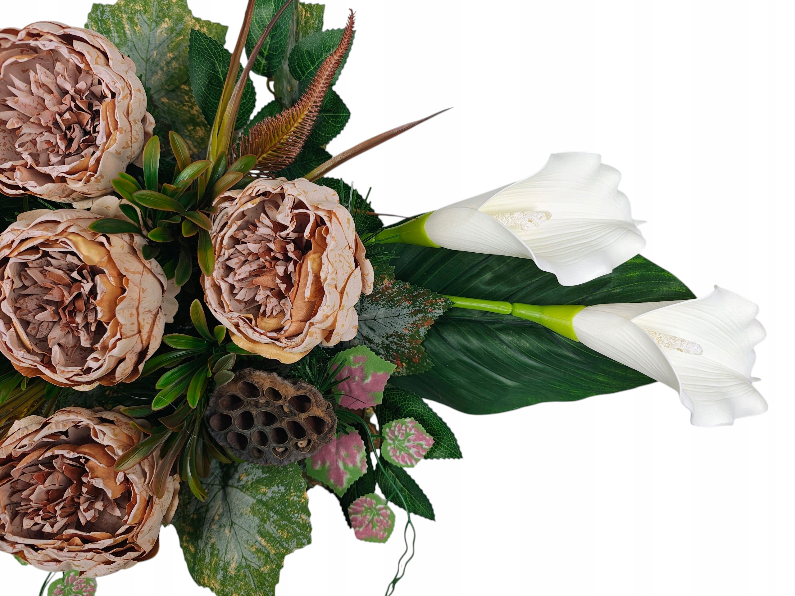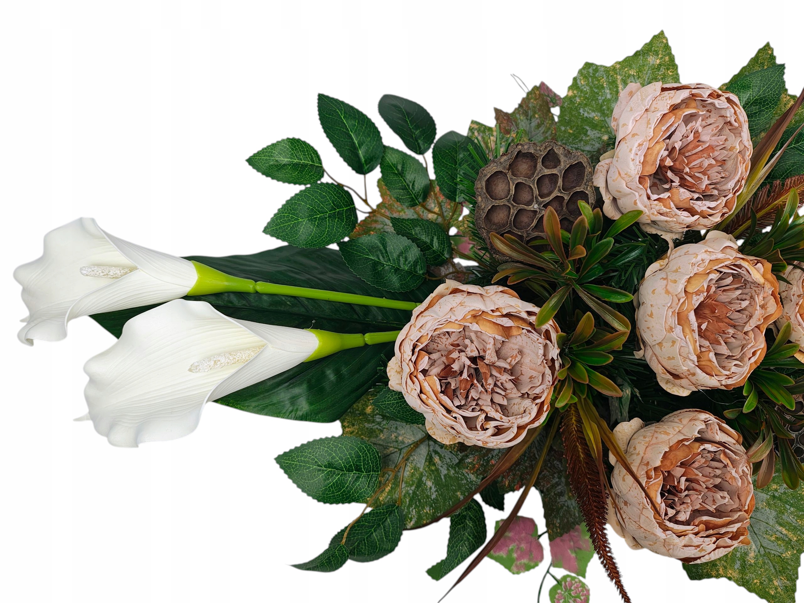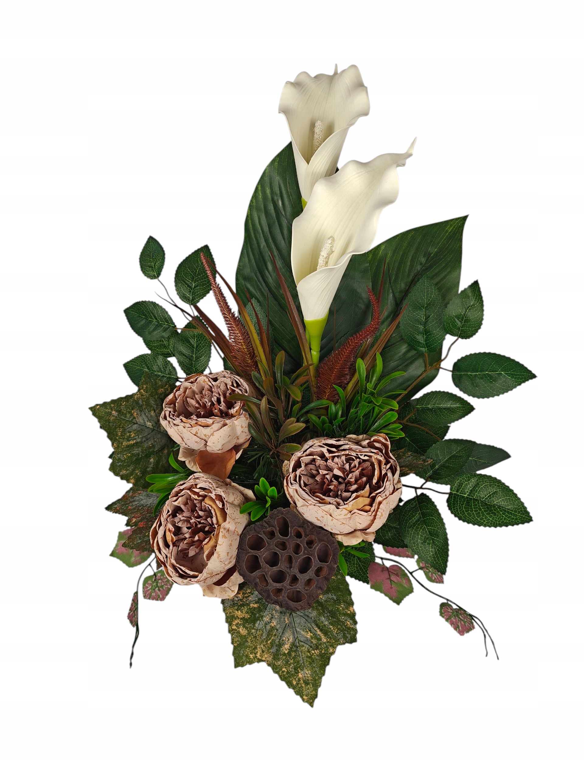 Декорація створена для гідного та красивого вшанування близьких. Пишна композиція чудово заповнює простір на надгробку, створюючи виразний, але водночас тонкий декор. Вставка вази створена таким чином, щоб її можна було стабільно розмістити в класичних надгробних вазах, завдяки чому все виглядає цілісним і елегантним.