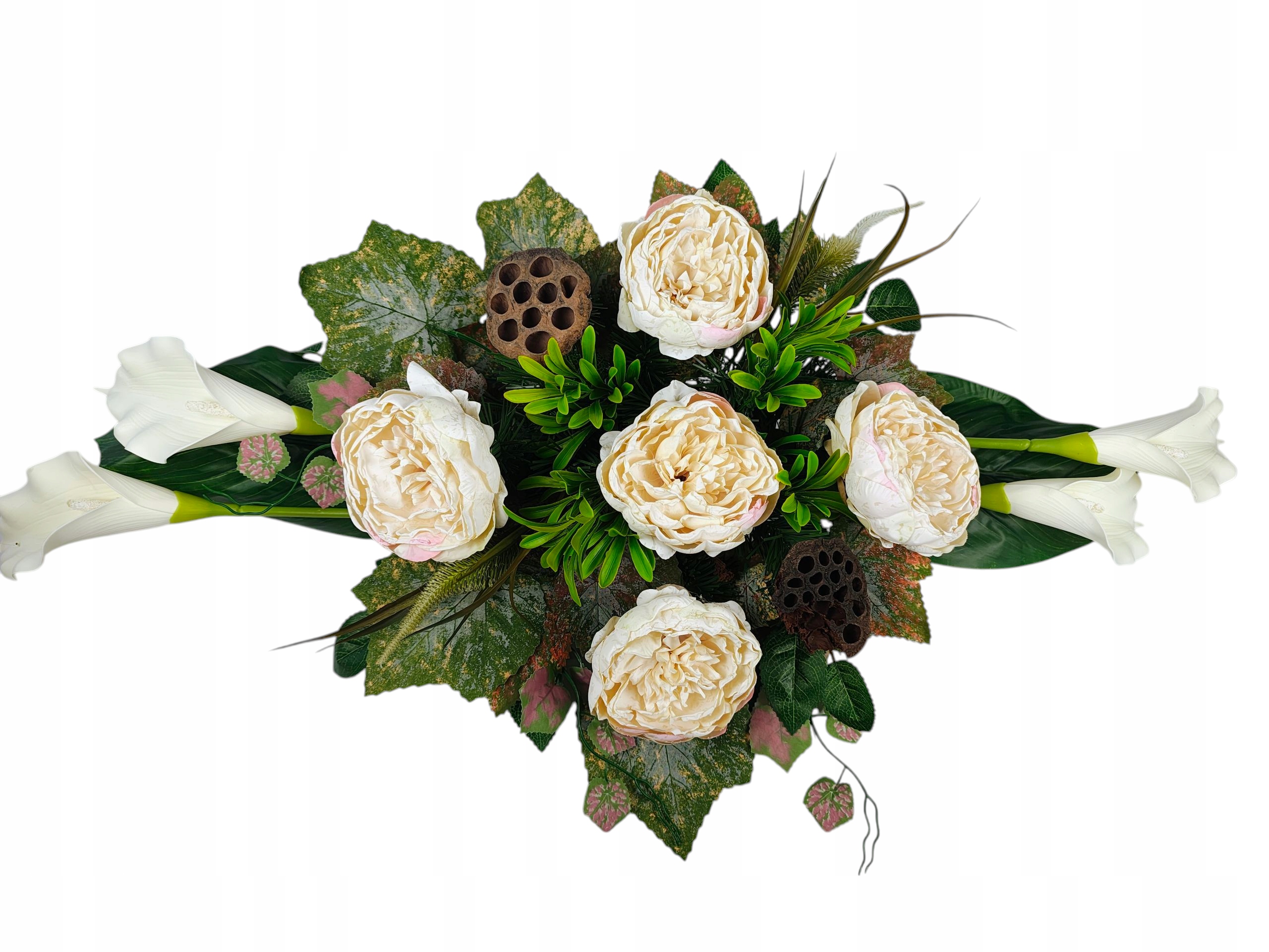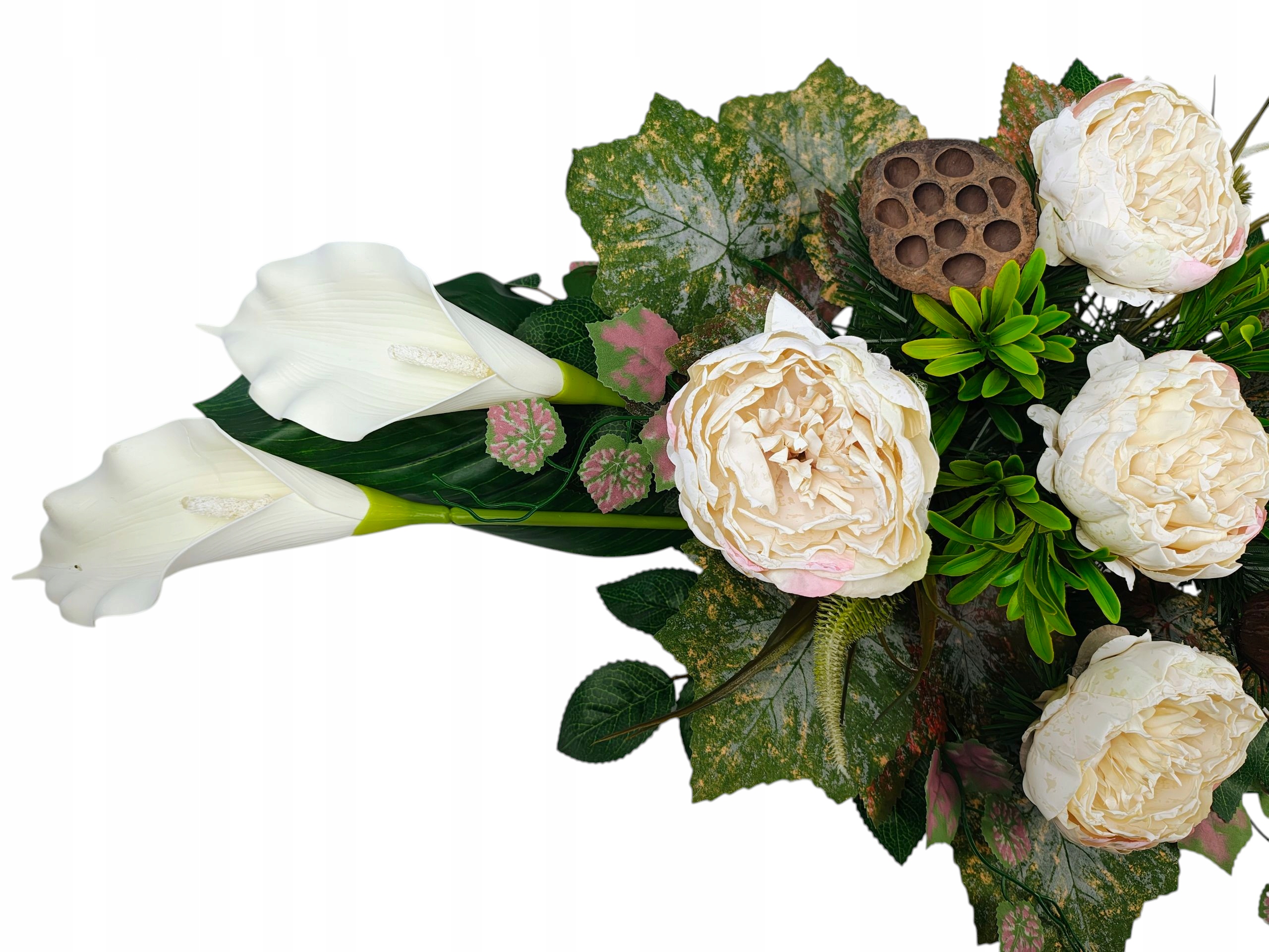 Декорація створена для гідного та красивого вшанування близьких. Пишна композиція чудово заповнює простір на надгробку, створюючи виразний, але водночас тонкий декор. Вставка вази створена таким чином, щоб її можна було стабільно розмістити в класичних надгробних вазах, завдяки чому все виглядає цілісним і елегантним.