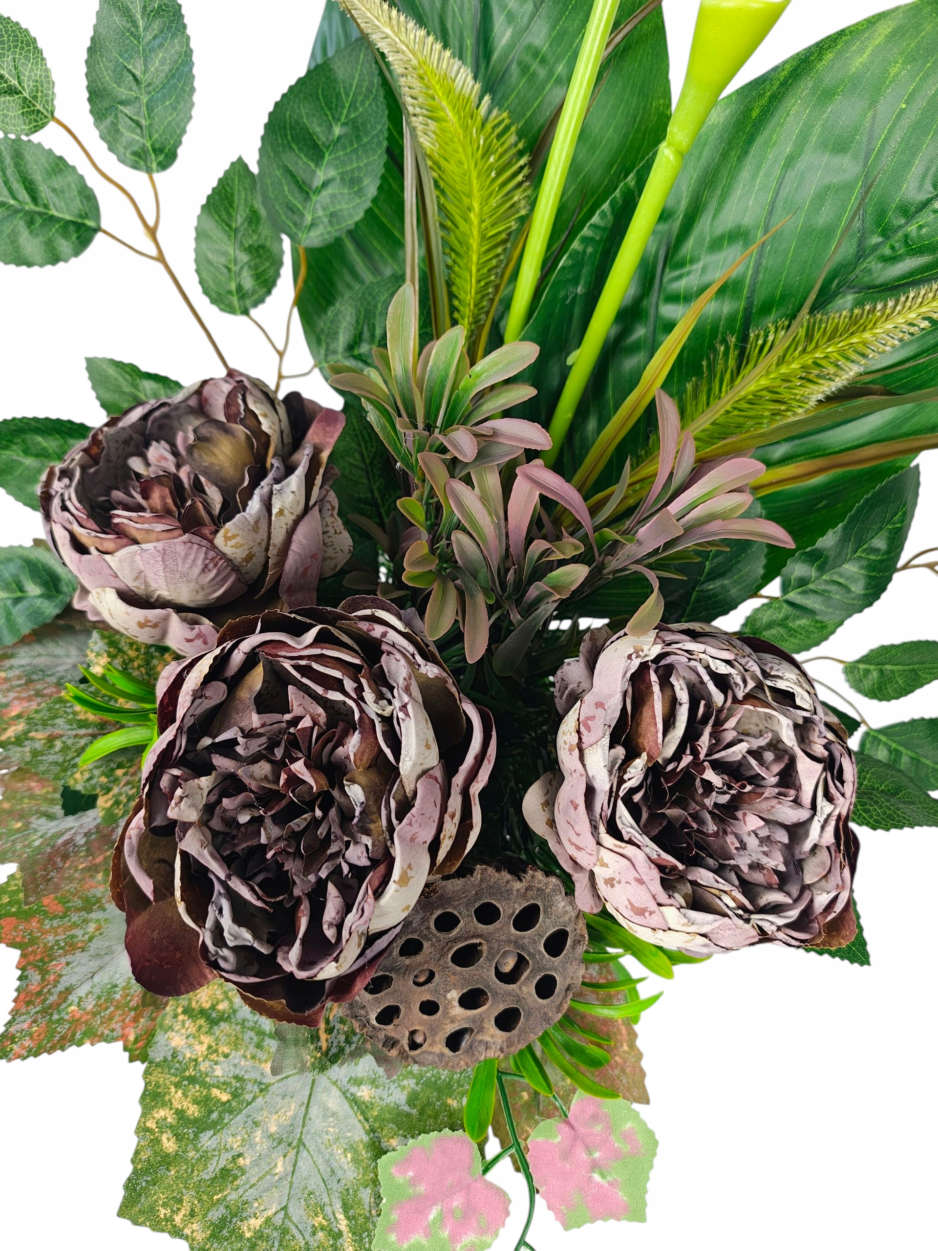 Декорація створена для гідного та красивого вшанування близьких. Пишна композиція чудово заповнює простір на надгробку, створюючи виразний, але водночас тонкий декор. Вставка вази створена таким чином, щоб її можна було стабільно розмістити в класичних надгробних вазах, завдяки чому все виглядає цілісним і елегантним.