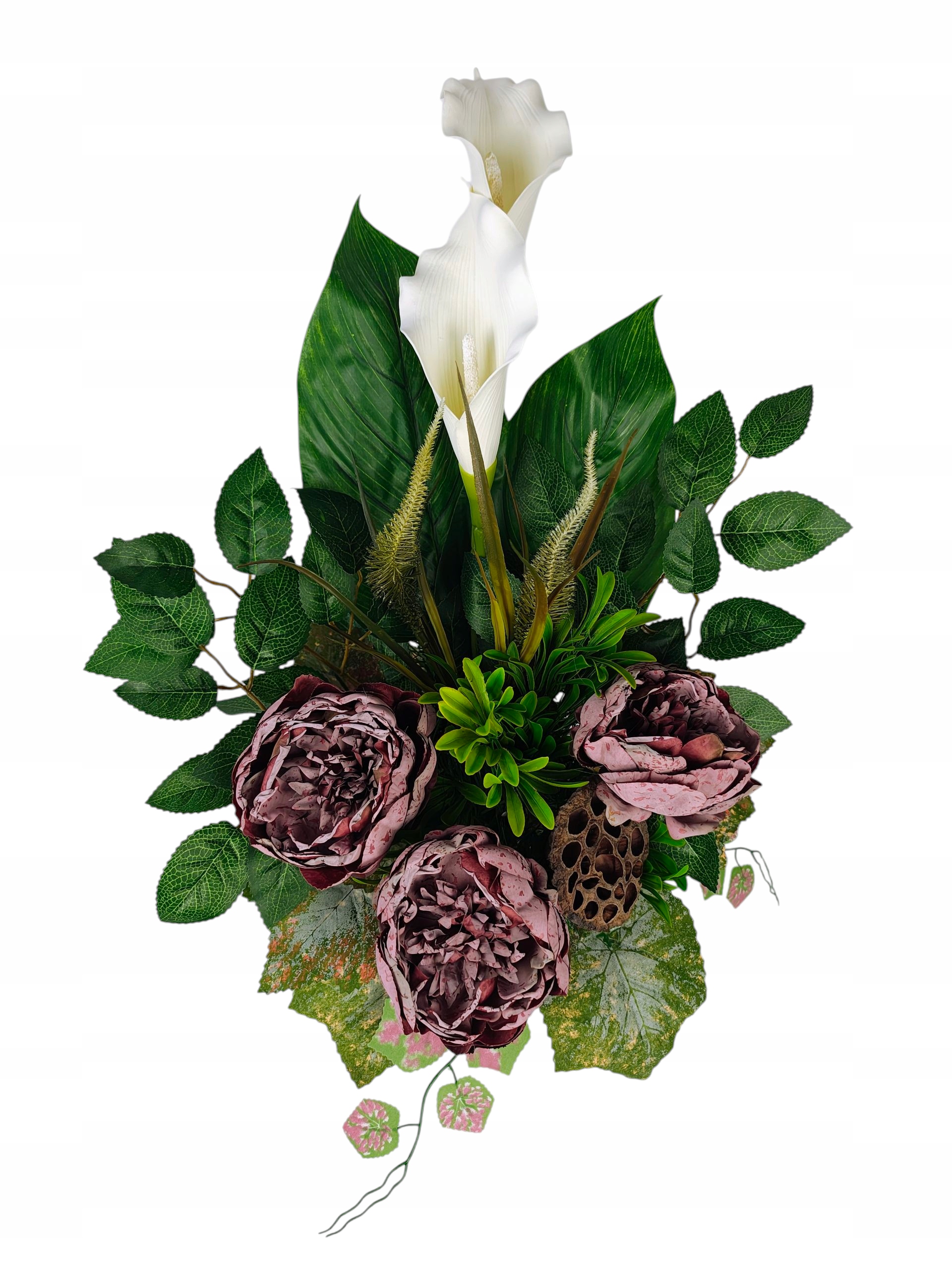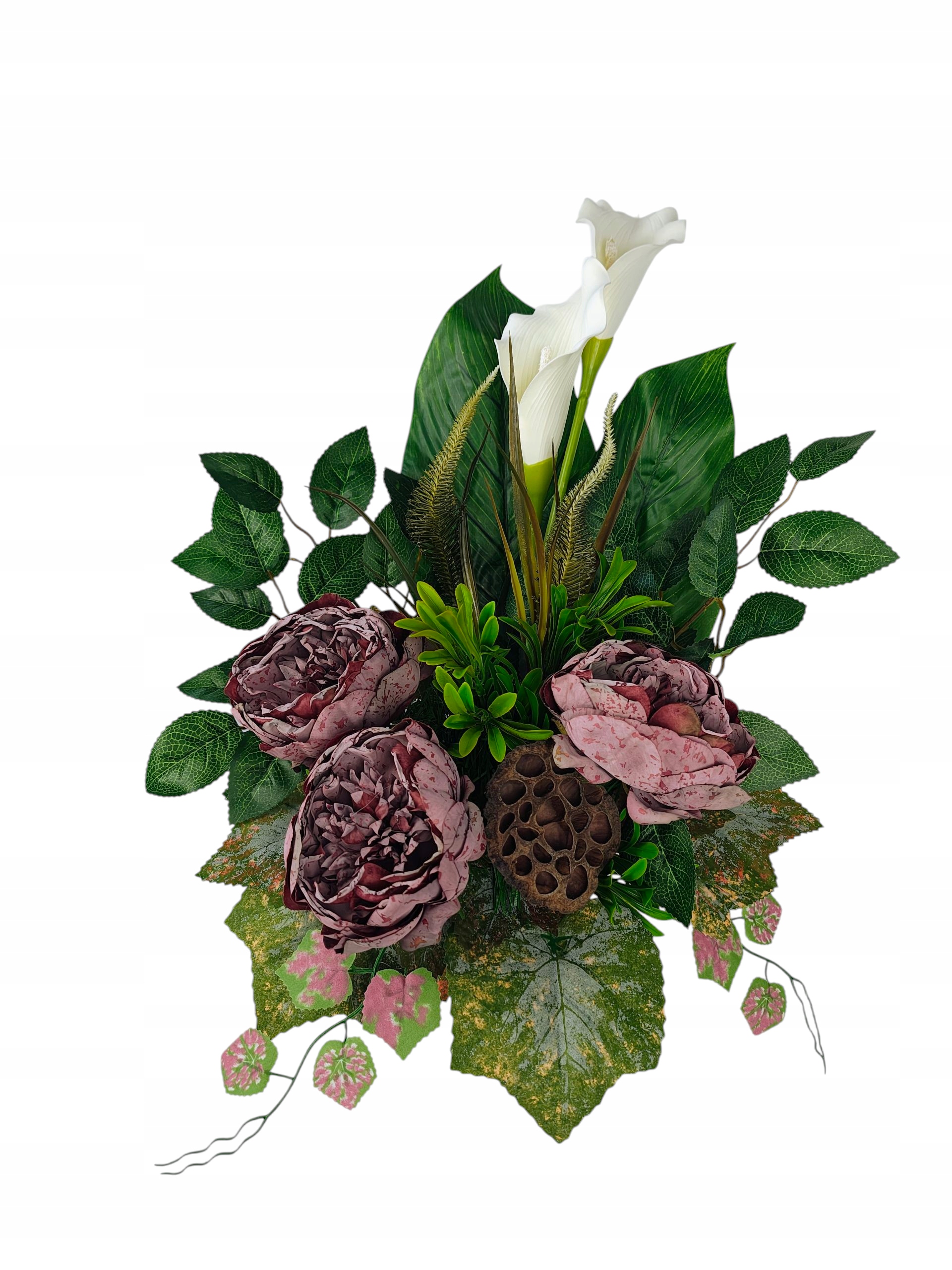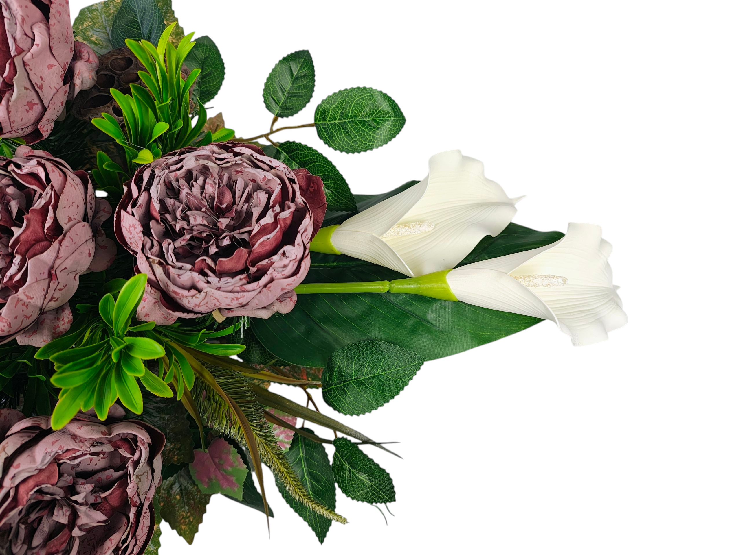 Декорація створена для гідного та красивого вшанування близьких. Пишна композиція чудово заповнює простір на надгробку, створюючи виразний, але водночас тонкий декор. Вставка вази створена таким чином, щоб її можна було стабільно розмістити в класичних надгробних вазах, завдяки чому все виглядає цілісним і елегантним.