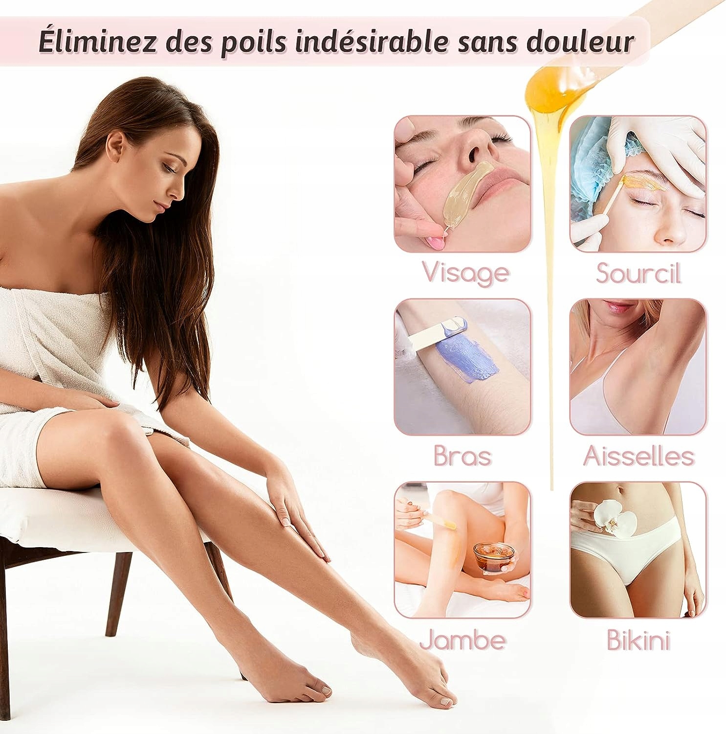 Не ходіть більше до косметолога для видалення волосся! Дійсно заощадите свій час. Воски виготовлені з натуральних і ніжних компонентів, вони просто видаляють небажане волосся на тілі. Його можна використовувати для обличчя, брів, рук, рук, пахв, ніг, бікіні тощо. Для вашої інформації рекомендуємо 200 г воску для депіляції половини ніг.