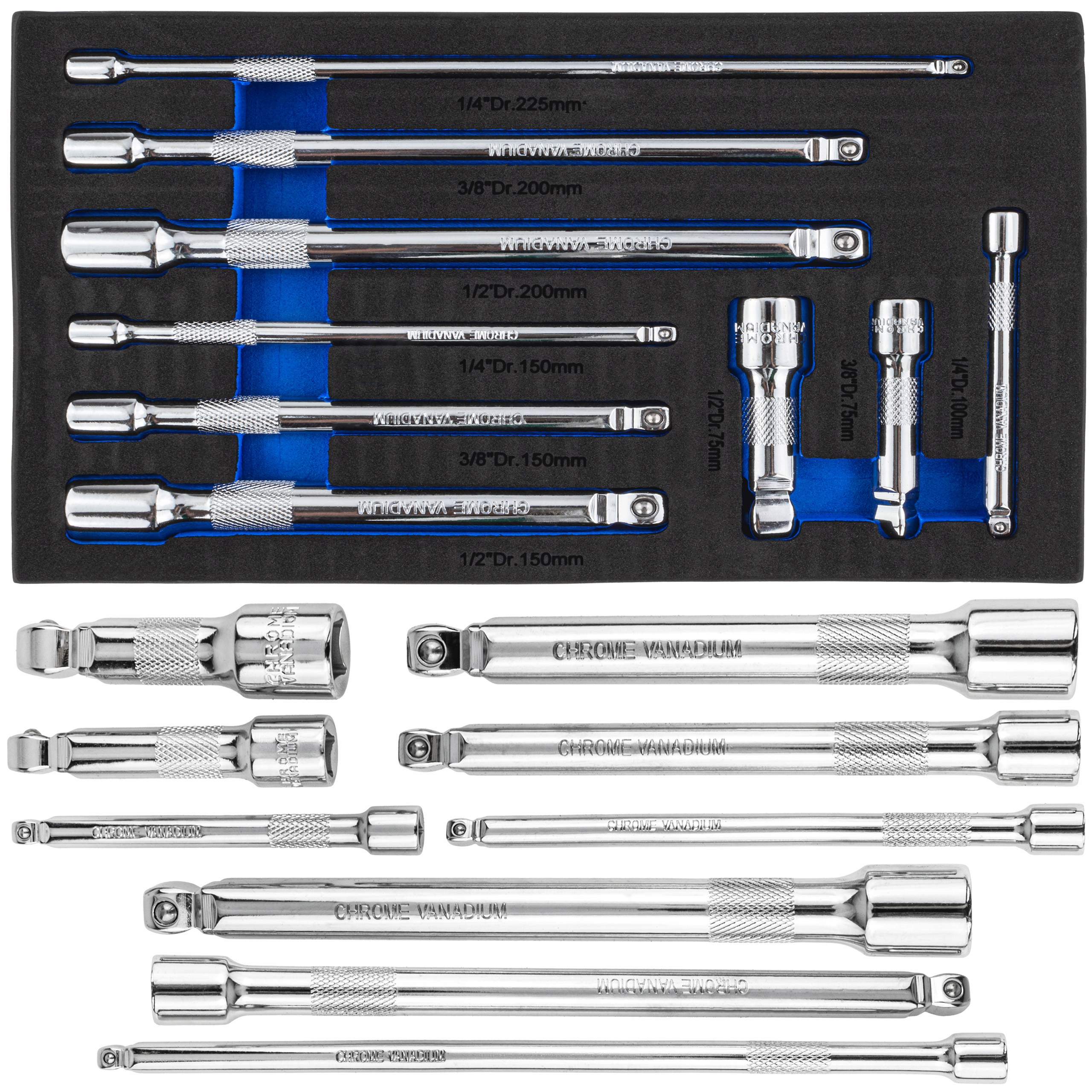 НАБІР НАХИЛНИХ ПОДОВЖУВАЛЬНИКІВ 1/2", 1/4", 3/8" 9 ЕЛЕМЕНТІВ + ВСТАВКА ДЛЯ ВІЗКА ДЛЯ МАЙСТЕРНІ