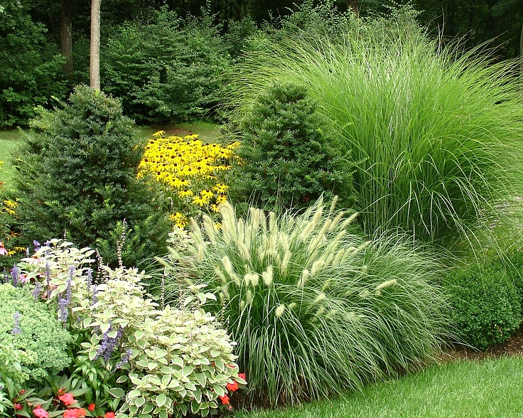 Трави чудово виглядають у композиціях з іншими багаторічними, однорічними та дворічними рослинами.