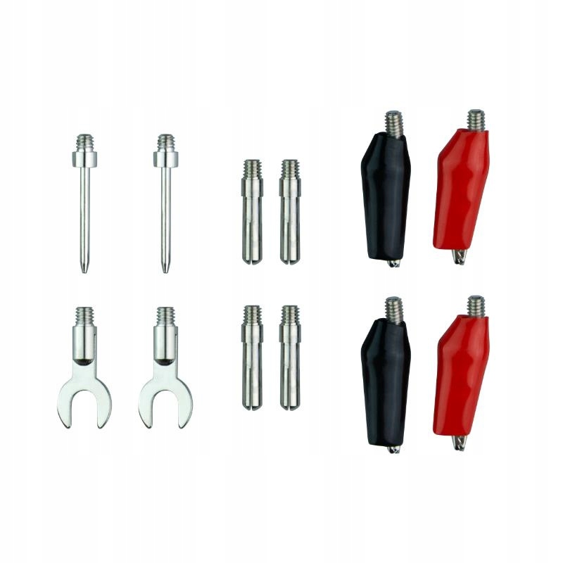 - Набір кабелів + 14 наконечників (2 х голчастий вимірювальний щуп, 2 х голкові наконечники, 2 х лопати, 4 х крокодилові затискачі, 4 х 4 мм бананові наконечники)