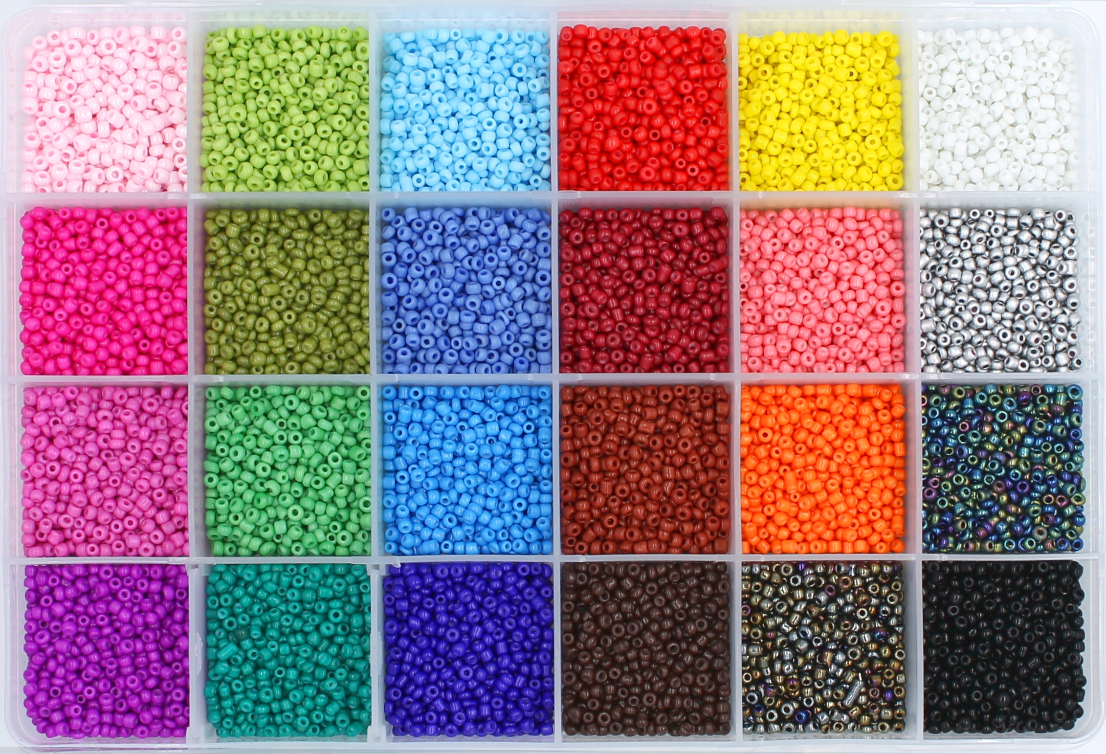 Бісер упакований в практичний закритий органайзер з ковпачком. Відділення на 24 упаковки.