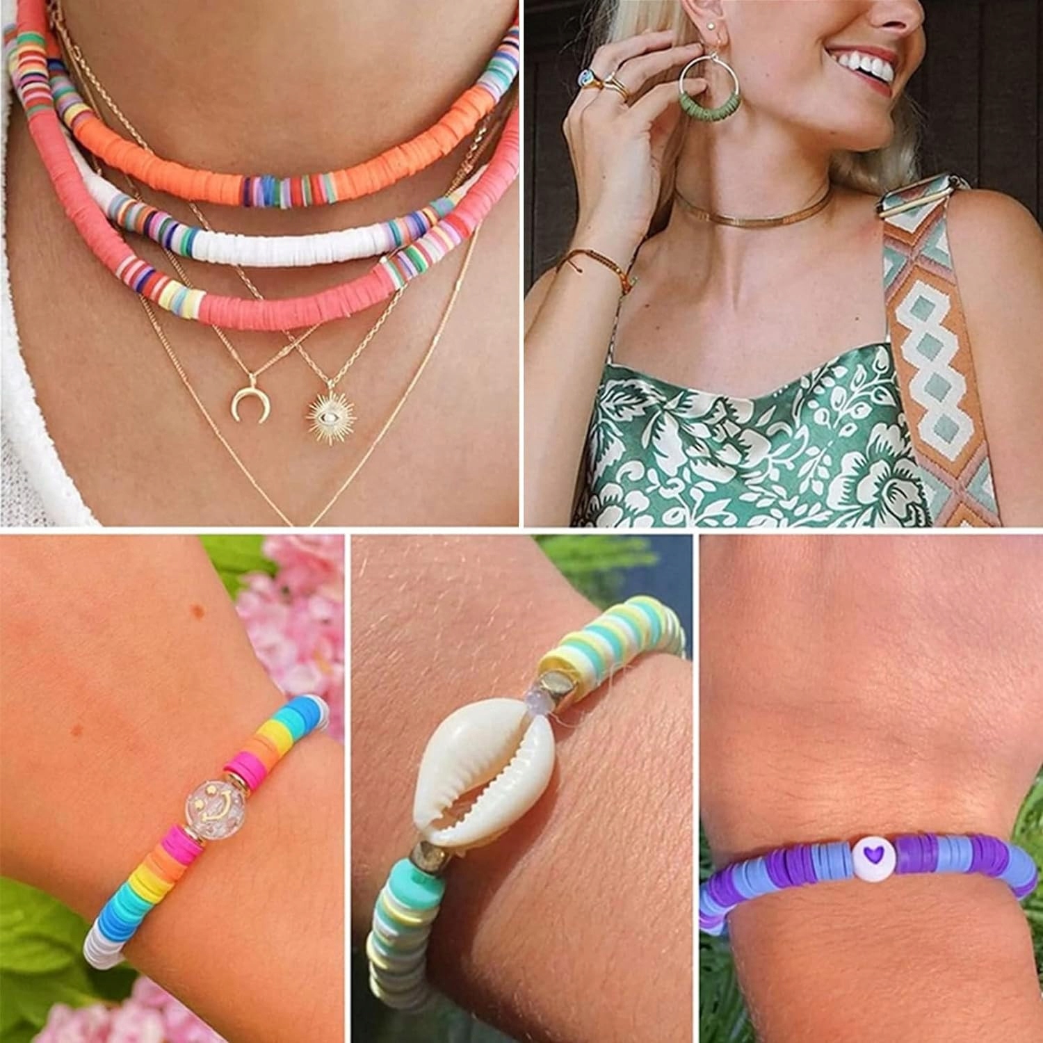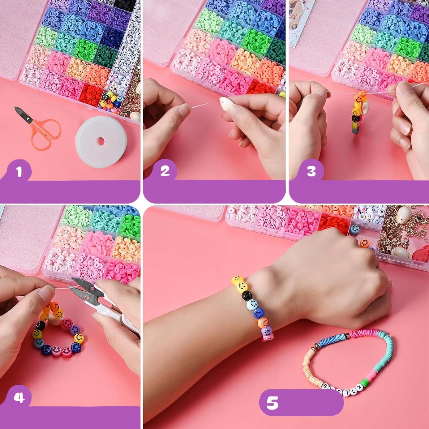 Магія кольорів, барвисті та золоті літери, серця, зірочки, підвіски з черепашок або унікальні шарми чи чарівні намистини з усмішкою та численні аксесуари дозволять маленький дизайнер для створення унікальних декоративних прикрас. Набір містить різнокольоровіплоскі намистиниі численні аксесуари, які дають безмежні можливості для створення модних прикрас, таких як: