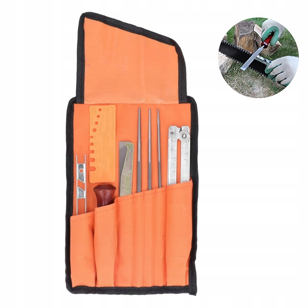 - Вміст набору: 3 круглі напилки, глибиномір, напилок для канавок, очисник канавок, тестовий ніж, тримач кутової направляючої, дерев'яна ручка, сумка для інструментів