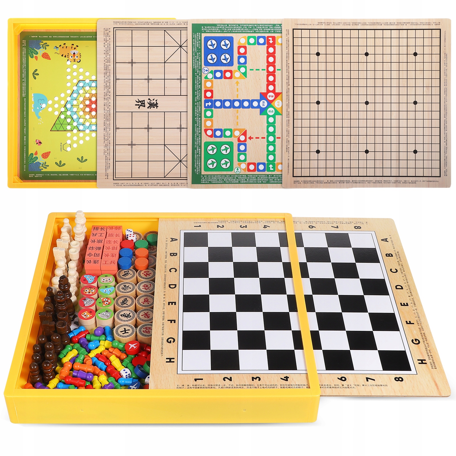 Цей багатофункціональний набір настільних ігор пропонує різноманітні ігри, зокрема літаючі шахи, китайські шахи, шашки тощо. Розроблена з думкою про дітей, ця настільна гра в шашки заохочує до інтерактивної гри та інтелектуального розвитку. Набір для настільної гри має привабливий дизайн, що робить його гарним доповненням до будь-якого ігрового вечора.