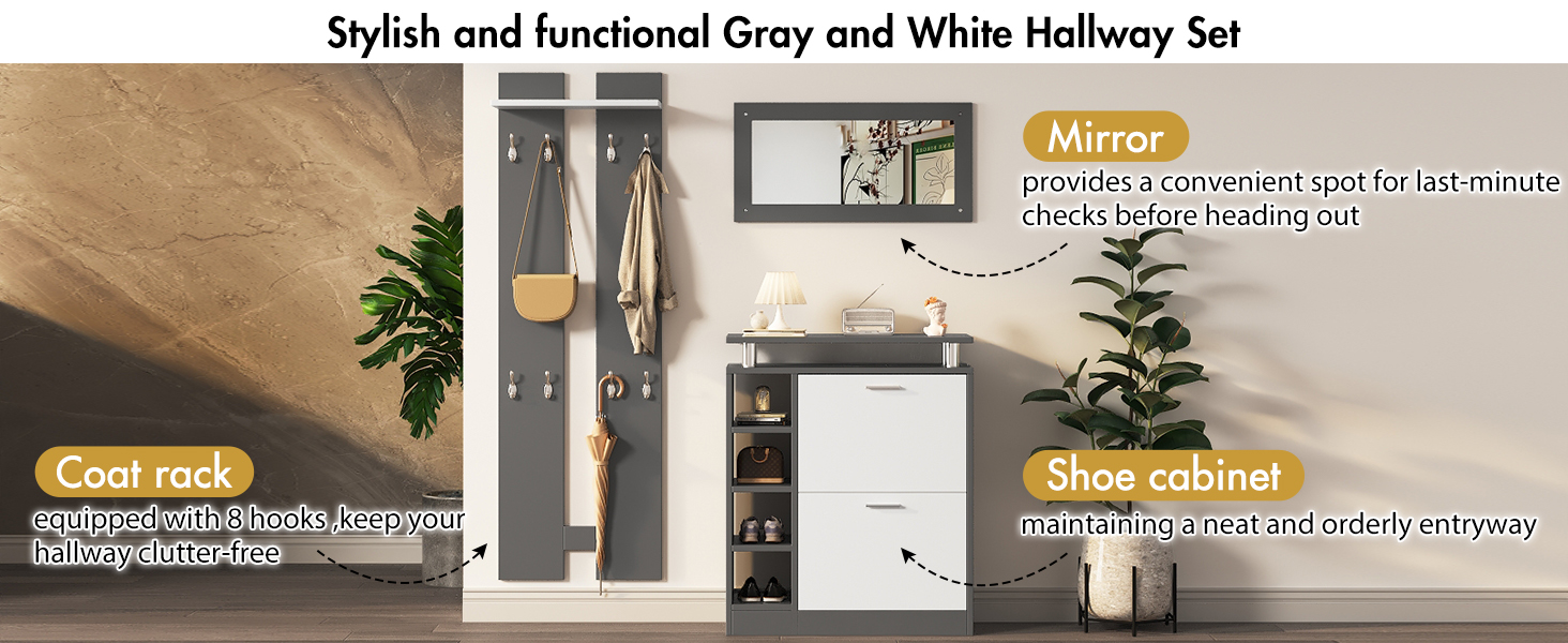 Сучасний набір сірих гардеробів ідеально підходить з будь -яким інтер'єром, ідеально підходить для вхідної зони і може бути використаний у всіх передпокої та коридорах, дійсно зберігає простір - 1 взуттєва шафа, 2 панелі шафи з поличками та стіновим дзеркальним дзеркала надає багато куртів для аксесуарів.