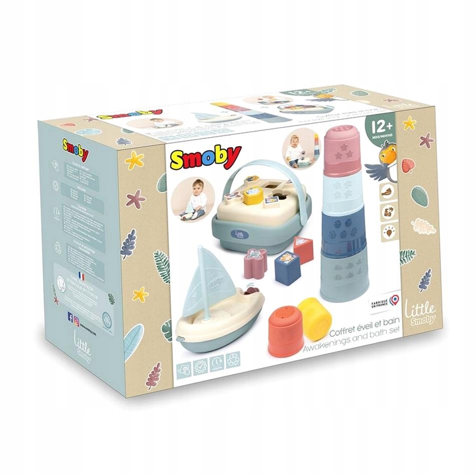 Набір для гри та купання складається з вежі, сортера з кубиками та кораблика. Вежа з 6 чашками для стекування, сортувальник форм, що складається з 8 форм (квадратів, трикутників, шестикутників), включаючи 4 блоки для вставки або розташування. Човен з вітрилом. Ідеально підходить для гри як у ванні, так і в кімнаті. Зроблено у Франції.