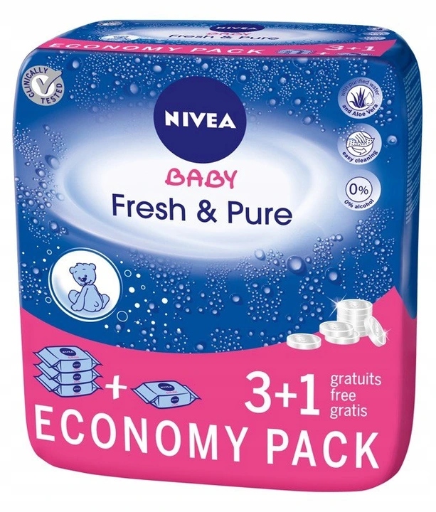 Дитячі серветки NIVEA Fresh & Pure унікально делікатна формула із зволожуючим лосьйоном на основі кришталево чистої води та м’якого екстракту алое вера. Вологі серветки для рота, рук і попи дбайливо очищають шкіру малюка, як чиста вода.