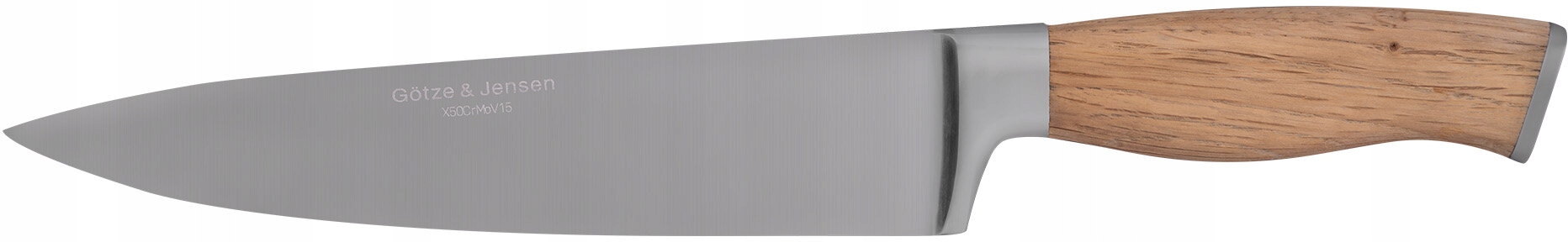 , виготовленої з дерева з дуба Ручка закінчується сталевим наконечником з друком , ймовірно, лежить у руці і призводить до того, що ножі götze & Jensen kn700 не відрізняються лише винятковою естетикою, але й доцільністю. Ножі ідеально розташовані в руці і не втомлюйте його під час приготування страв.