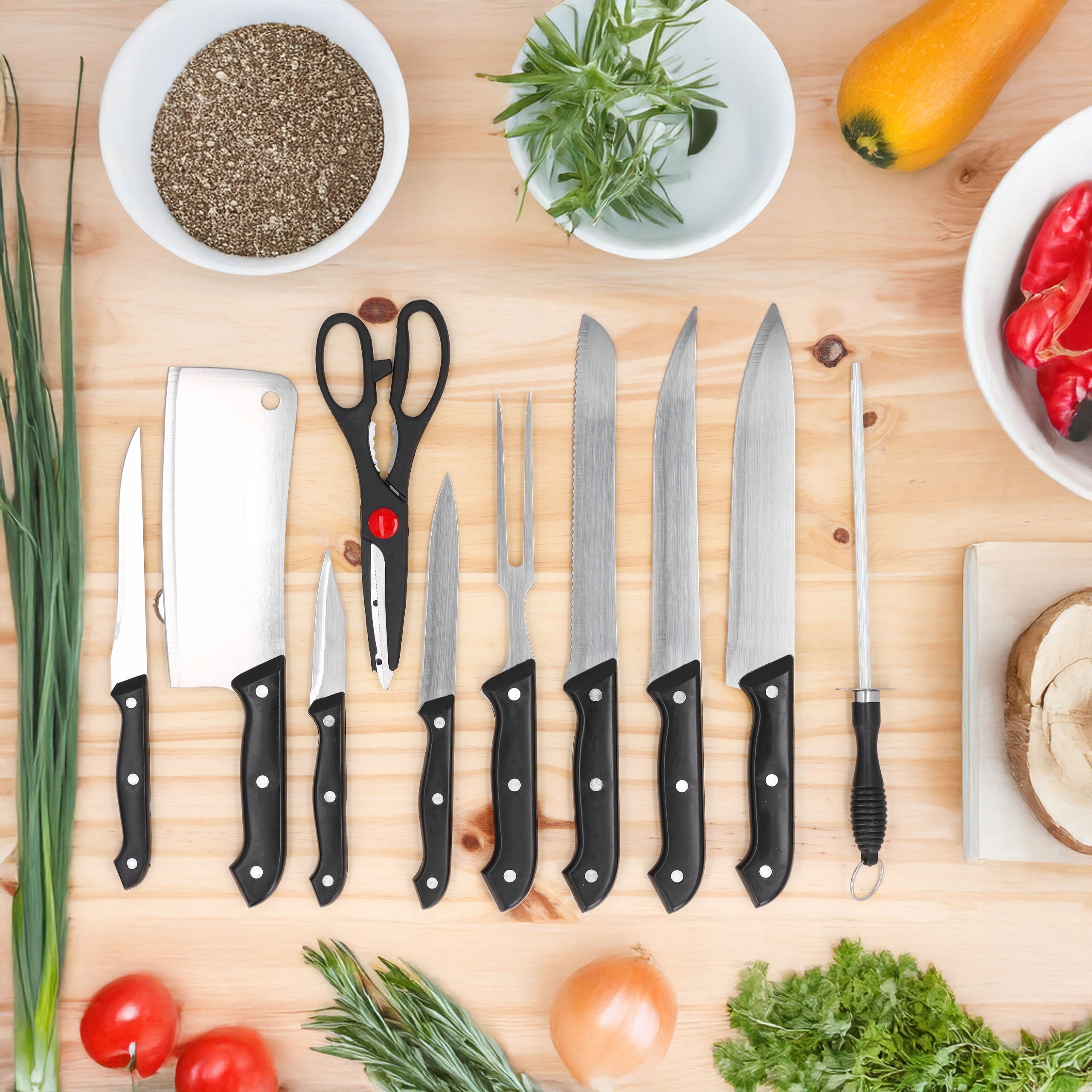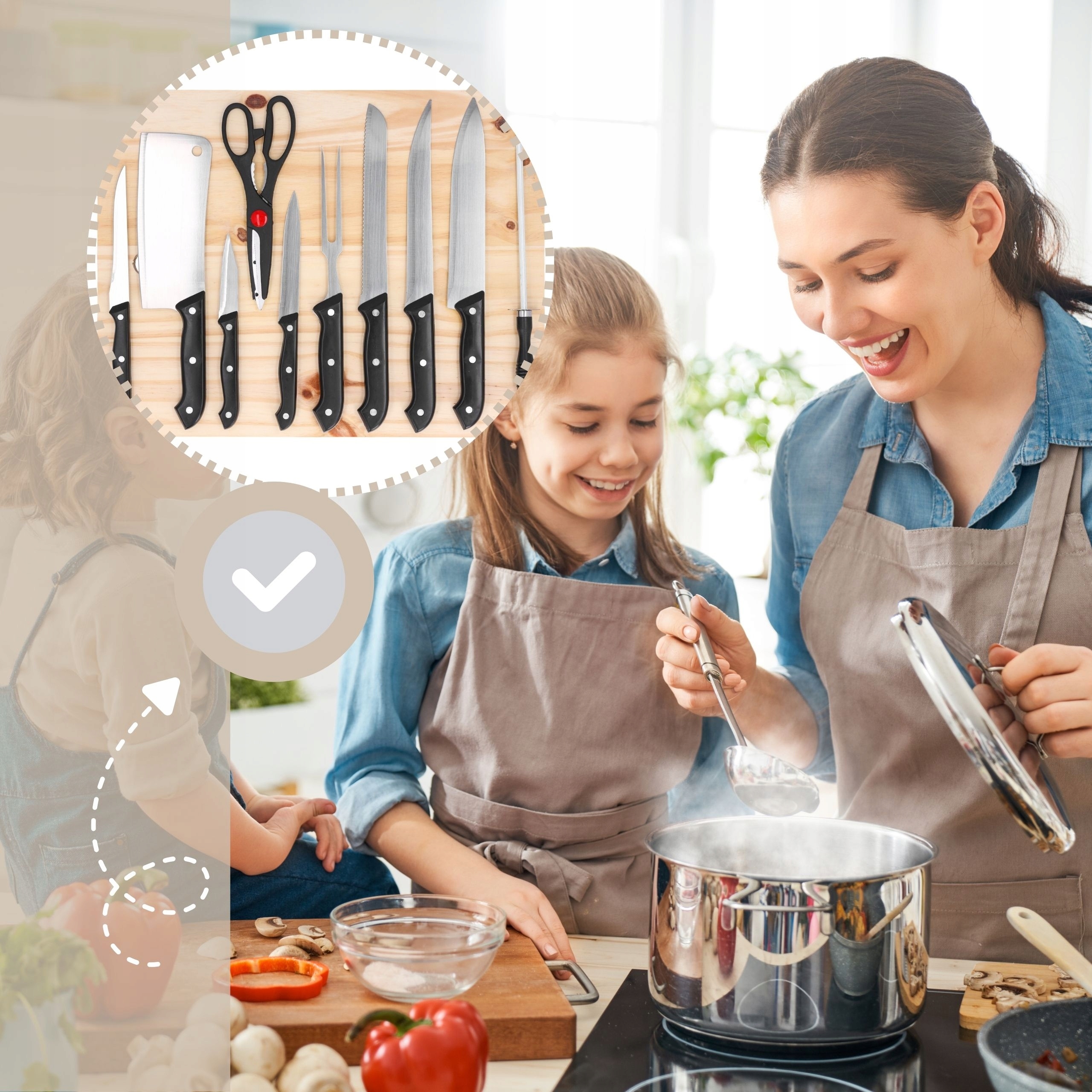 Повний кухонний набір для тих, хто цінує функціональність, естетику та довговічність. У набір входить 11 елементів, які дозволяють різноманітно готувати страви - від нарізання хліба, чищення овочів до філетування м'яса. Ножі виготовлені з нержавіючої сталі SS (2CR14), з повним хвостом (Full Tang), що гарантує їх стабільність і довговічність. ПП-ручки забезпечують міцний хват і зручність використання. Все це доповнюється міцною дерев'яною обробною дошкою та практичним сталевим точильним каменем.