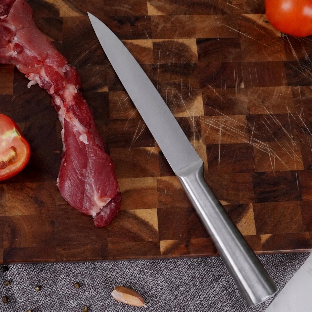 - Кухонний ніж – універсальний інструмент, найкраще підходить для нарізання м’яса чи нарізки