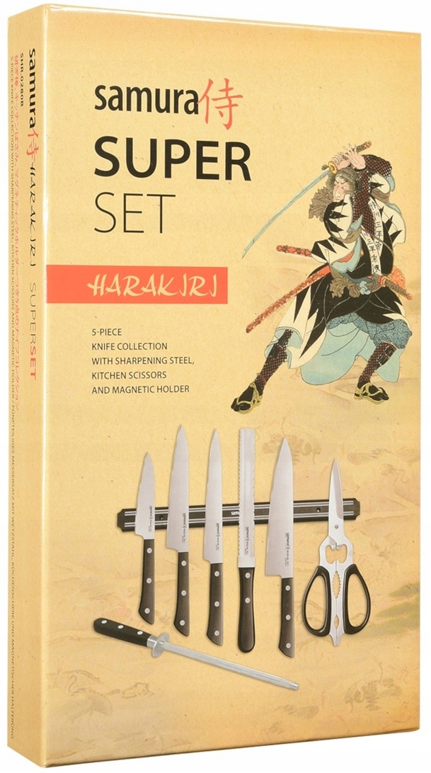 нержавіюча сталь AUS 8. Набір із 5 ножів HARAKIRI (Chef, Slicer, для хліба та заморожених продуктів, універсальний, для різання) SAMURA