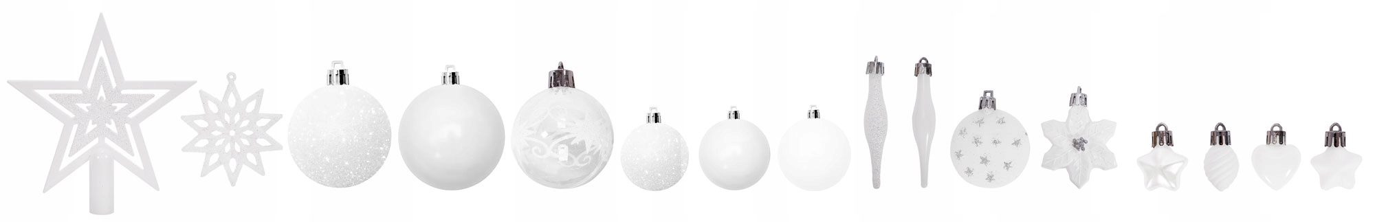 Набір містить різні візерунки кульок білого кольору. Набір складається з кульок трьох розмірів : 4,5 см, 3,5 см і 2,5 см. Прикраси мають різноманітні візерунки, структури та оздоблення, завдяки чому вони урізноманітнюють зовнішній вигляд ялинки.