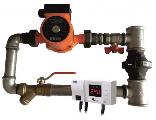 Контролер CS-07 призначений для управління насосом циркуляції водного ланцюга. Завдання регулятора полягає в тому, щоб увімкнути насос, якщо температура перевищує бажане значення, і вимкніть його, якщо котел охолоне (внаслідок гасіння). Це запобігає непотрібному насосу, який економить електроенергію (заощадження, залежно від ступеня вживання котла, досягають до 60%), а також термін експлуатації насоса.