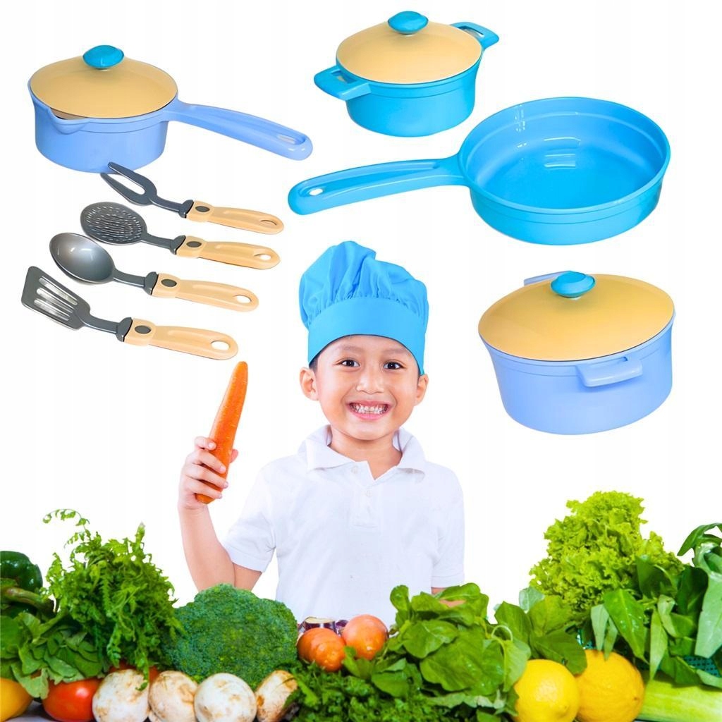 Набір іграшкового посуду виконано в сучасних кольорах. Всього в набір входять 11 елементів, серед яких: 2 каструлі, сковорода, каструля, три кришки, а також ополоник, шумівка, велика кухарська виделка та лопатка.