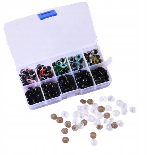 Набір затискних очей для талісманів у зручній коробці. Набір містить приблизно 100 люверсів (тобто 50 пар). На кожен ніс і вушко кріпиться кліпса; всі затискачі упаковані в окремий поліетиленовий пакет, який додається до коробки.
