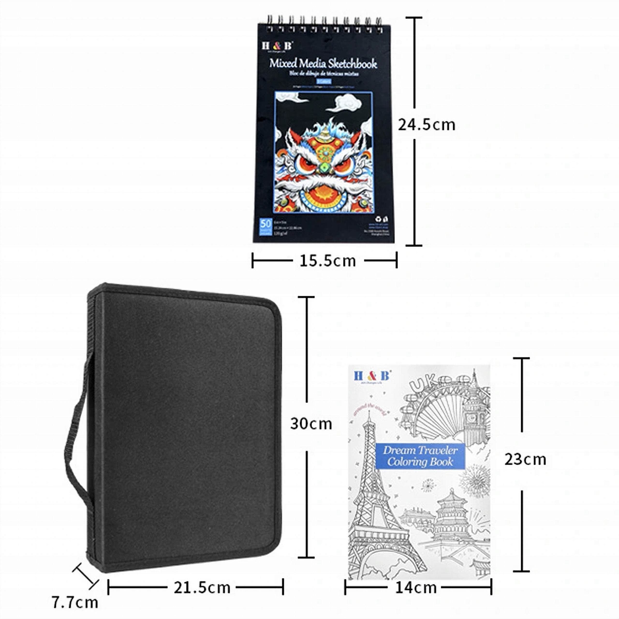 Повний професійний набір для малювання, ескізів і розфарбовування. Містить 142 елементи, включаючи величезну палітру з 100 кольорових олівців, графітних і вугільних олівців. Крім того, набір включає численні аксесуари, такі як: двосторонній маркер, канцелярський ніж, ластик, подвійний подовжувач для олівця. , точило, шліфувальну машину 3x, наждачний папір, альбом для малюнків формату А5 та стильний футляр.
