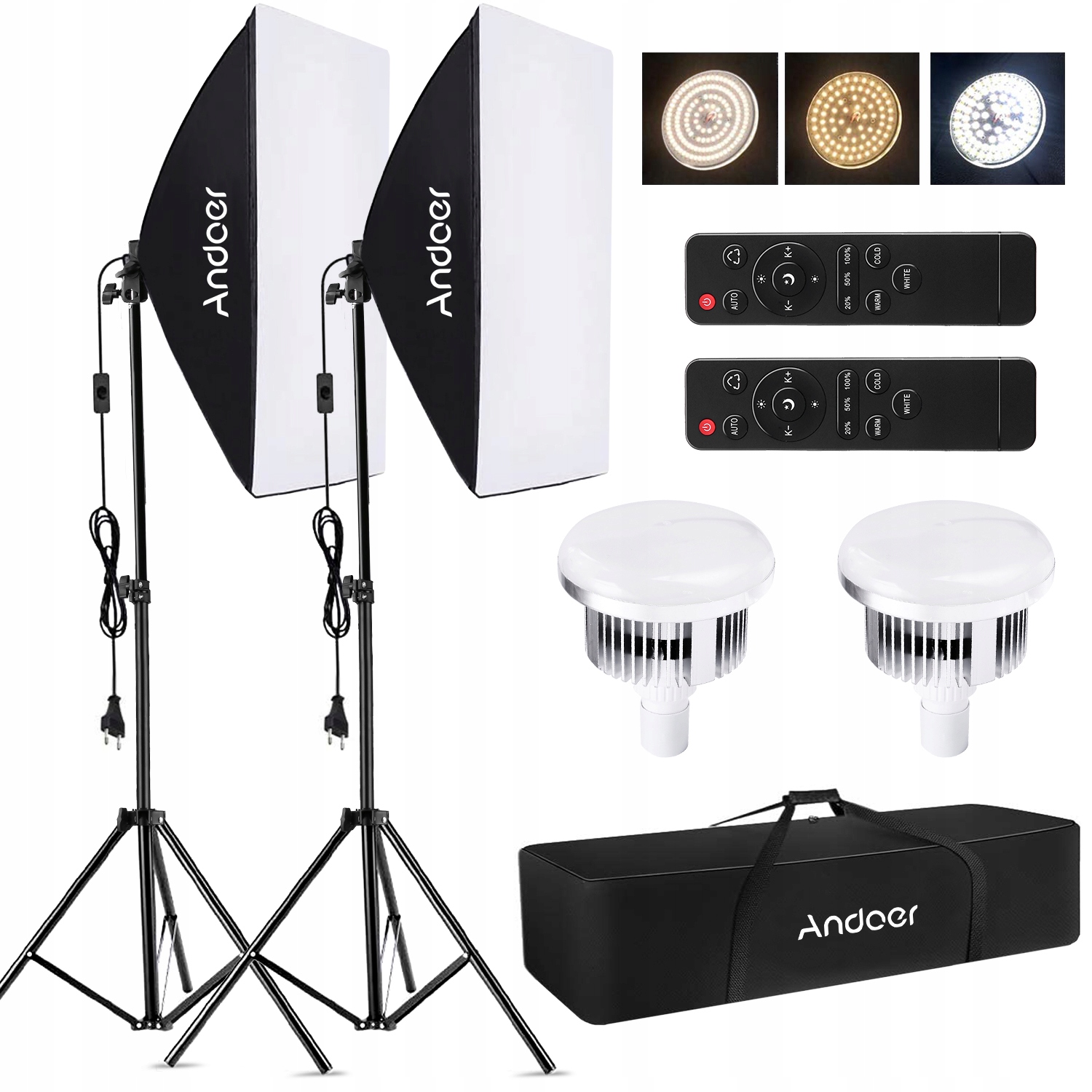 Професійний набір освітлення для студійної фотографії: містить 2 світлодіодні світильники, 2 софтбокси, 2 статистики освітлення, 2 пульта дистанційного керування та 1 ручка. Набір ідеально підходить для запису відео в домашніх умовах/студії, трансмісії в прямому ефірі, макіяжі, портретах та фотографії продуктів, фотографій, дитячих фотосесій тощо.